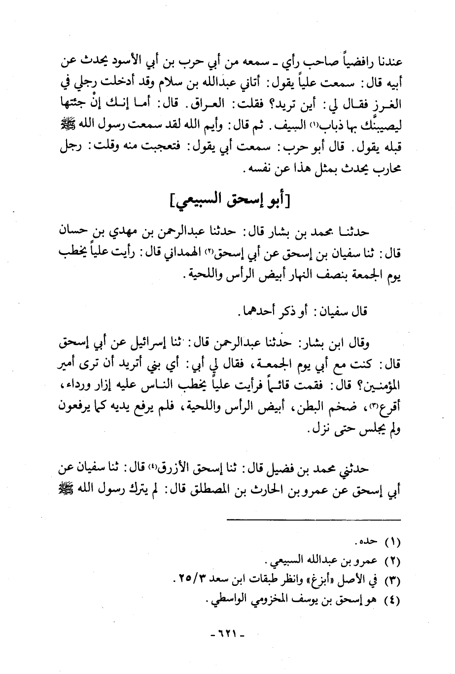 حَدَّثَنَا مُحَمَّدُ بْنُ بَشَّارٍ قَالَ: حَدَّثَنَا عَبْدُ الرَّحْمَنِ بْنُ مَهْدِيِّ بْنِ حَسَّانٍ قَالَ: ثنا سفيان بن إِسْحَاقَ عَنْ أَبِي إِسْحَاقَ [2] الْهَمْدَانِيِّ قَالَ: رَأَيْتُ عَلِيًّا يَخْطُبُ يَوْمَ الْجُمُعَةِ بِنِصْفِ النَّهَارِ أَبْيَضَ الرَّأْسِ وَاللِّحْيَةِ.