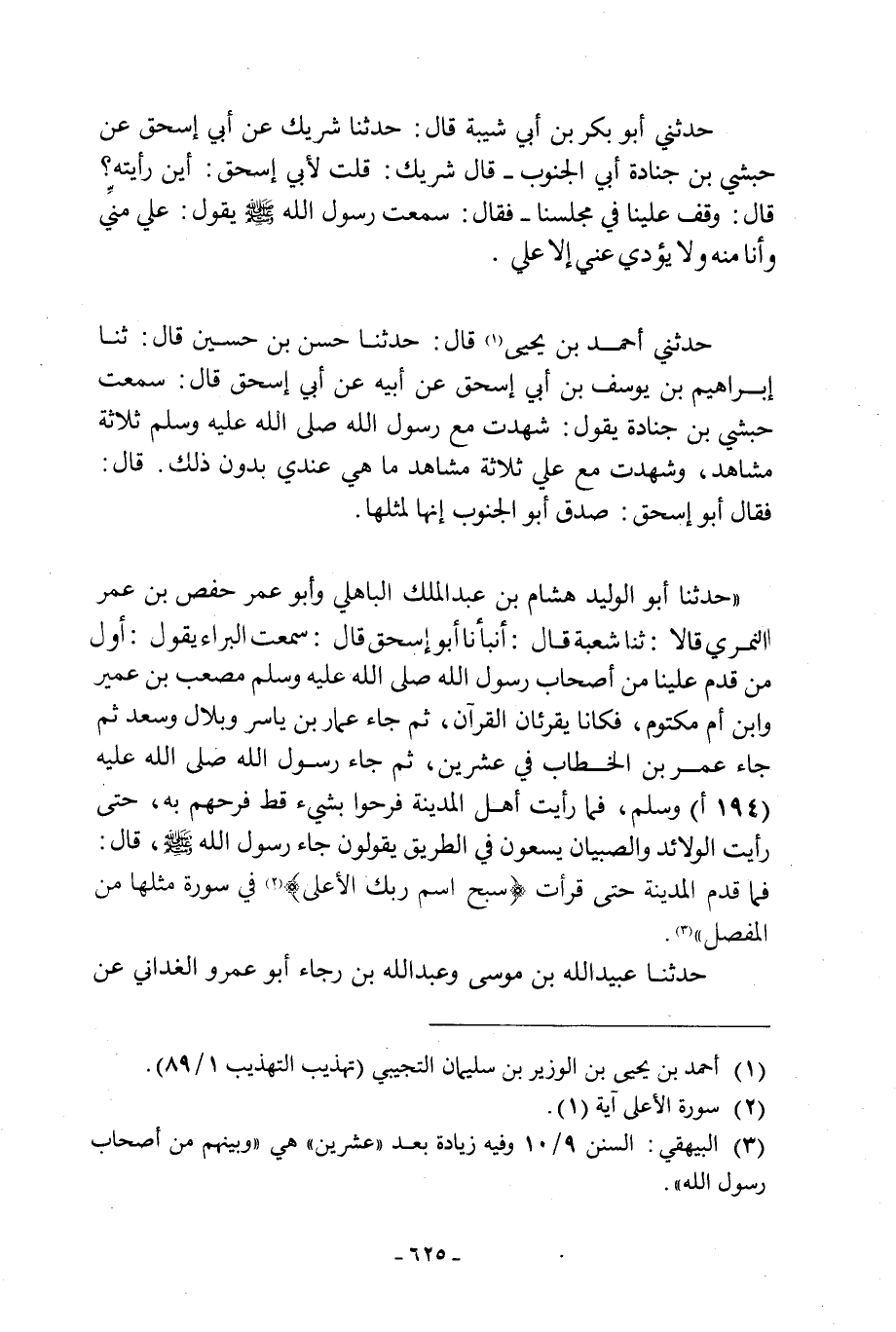 حدثني أبو بكر بن أبي شيبة قال: حَدَّثَنَا شَرِيكٌ عَنْ أَبِي إِسْحَاقَ عَنْ حَبَشِيِّ بْنِ جُنَادَةَ أَبِي الْجَنُوبِ- قَالَ شَرِيكٌ: قُلْتُ لِأَبِي إِسْحَاقَ: أَيْنَ رَأَيْتَهُ؟ قَالَ: وَقَفَ عَلَيْنَا فِي مَجْلِسِنَا- فَقَالَ: سَمِعْتُ رَسُولَ اللَّهِ صَلَّى الله عليه سلم يَقُولُ: عَلِيٌّ مِنِّي وَأَنَا مِنْهُ لَا يُؤَدِّي عني الا علي. حدثني احمد بن يحي [1] قَالَ: حَدَّثَنَا حَسَنُ بْنُ حُسَيْنٍ قَالَ: ثنا إِبْرَاهِيمُ بْنُ يُوسُفَ بْنِ أَبِي إِسْحَاقَ عَنْ أَبِيهِ عَنْ أَبِي إِسْحَاقَ قَالَ: سَمِعْتُ حَبَشِيَّ بْنَ جُنَادَةَ يَقُولُ: شَهِدْتُ مَعَ رَسُولِ اللَّهِ صَلَّى اللَّهُ عَلَيْهِ وَسَلَّمَ ثَلَاثَةَ مَشَاهِدَ، وَشَهِدْتُ مَعَ عَلِيٍّ ثَلَاثَةَ مَشَاهِدَ مَا هِيَ عِنْدِي بِدُونِ ذَلِكَ. قَالَ:
