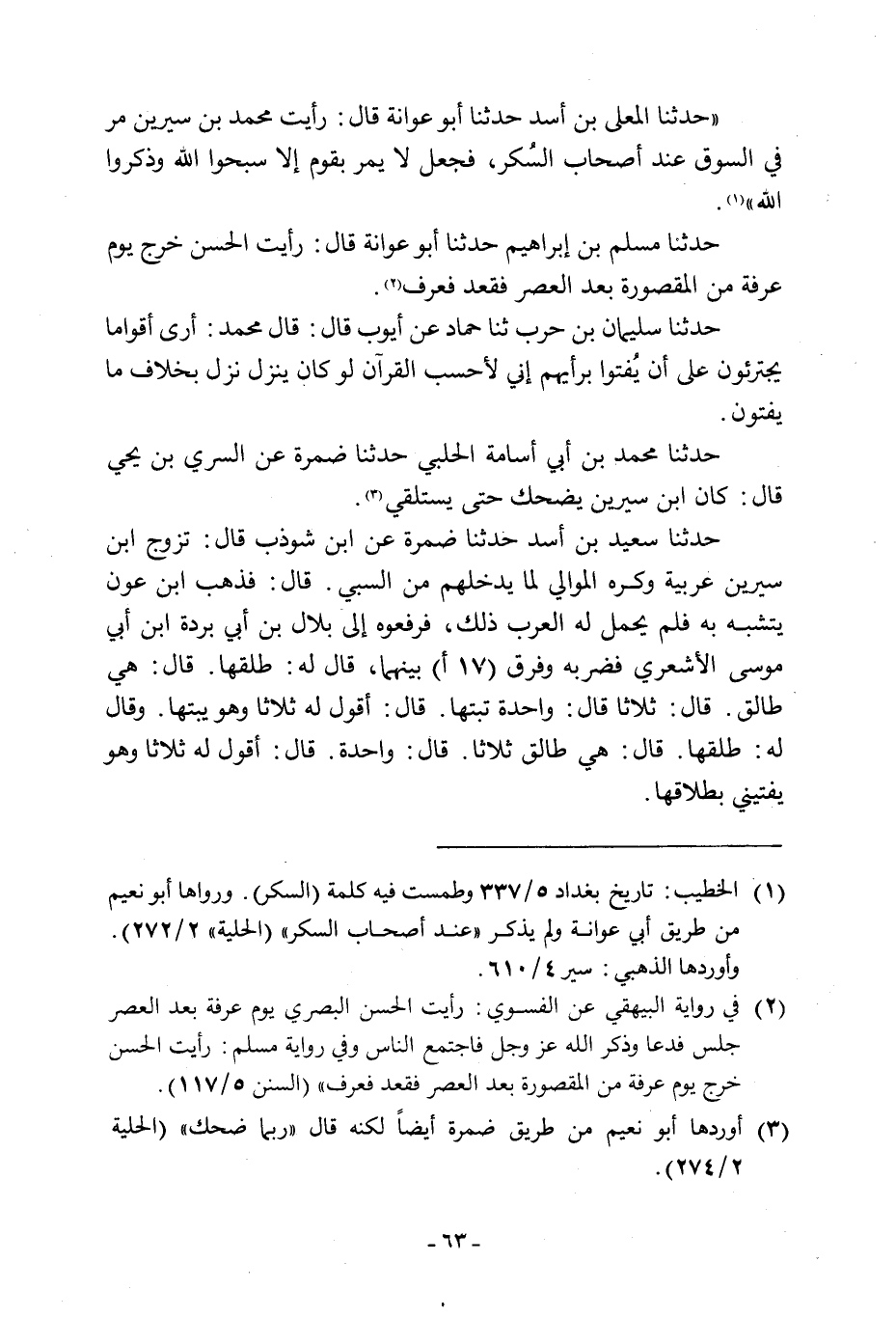«حَدَّثَنَا الْمُعَلَّى بْنُ أَسَدٍ حَدَّثَنَا أَبُو عَوَانَةَ قَالَ: رَأَيْتُ مُحَمَّدَ بْنَ سِيرِينَ مَرَّ فِي السُّوقِ عِنْدَ أَصْحَابِ السُّكَّرِ، فَجَعَلَ لَا يَمُرُّ بِقَوْمٍ إِلَّا سَبَّحُوا اللَّهَ وَذَكَرُوا اللَّهَ» [1] .
