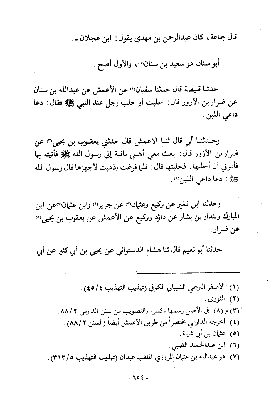 حَدَّثَنَا قَبِيصَةُ قَالَ حَدَّثَنَا سُفْيَانُ [2] عَنِ الْأَعْمَشِ عَنْ عَبْدِ اللَّهِ بْنِ سِنَانٍ عَنْ ضِرَارِ بْنِ الْأَزْوَرِ قَالَ: حَلَبْتُ أَوْ حَلَبَ رَجُلٌ عِنْدَ النَّبِيِّ صَلَّى اللَّهُ عَلَيْهِ وَسَلَّمَ فَقَالَ: دَعَا دَاعِيَ اللبن. وحدثنا أَبِي قَالَ ثنا الْأَعْمَشُ قَالَ حَدَّثَنِي يَعْقُوبُ بن يحي [3] عن ضرار ابن الْأَزْوَرِ قَالَ: بَعَثَ مَعِي أَهْلِي نَاقَةً إِلَى رسول الله صلى الله عليه فَأَتَيْتُهُ بِهَا فَأَمَرَنِي أَنْ أَحْلُبَهَا فَحَلَبْتُهَا. قَالَ: فَلَمَّا فَرَغْتُ وَذَهَبْتُ لِأُجَهِّزَهَا قَالَ رَسُولُ اللَّهِ صَلَّى اللَّهُ عَلَيْهِ وَسَلَّمَ: دَعَا دَاعِيَ اللَّبَنِ [4] . وَحَدَّثَنَا ابْنُ نُمَيْرٍ عَنْ وَكِيعٍ وَعُثْمَانَ [5] عَنْ جَرِيرٍ [6] وَابْنِ عُثْمَانَ [7] عَنِ ابْنِ الْمُبَارَكِ وَبُنْدَارِ بْنِ بَشَّارٍ عَنْ دَاوُدَ وَوَكِيعٍ عَنِ الْأَعْمَشِ عن يعقوب ابن يحي [8] عَنْ ضِرَارٍ.