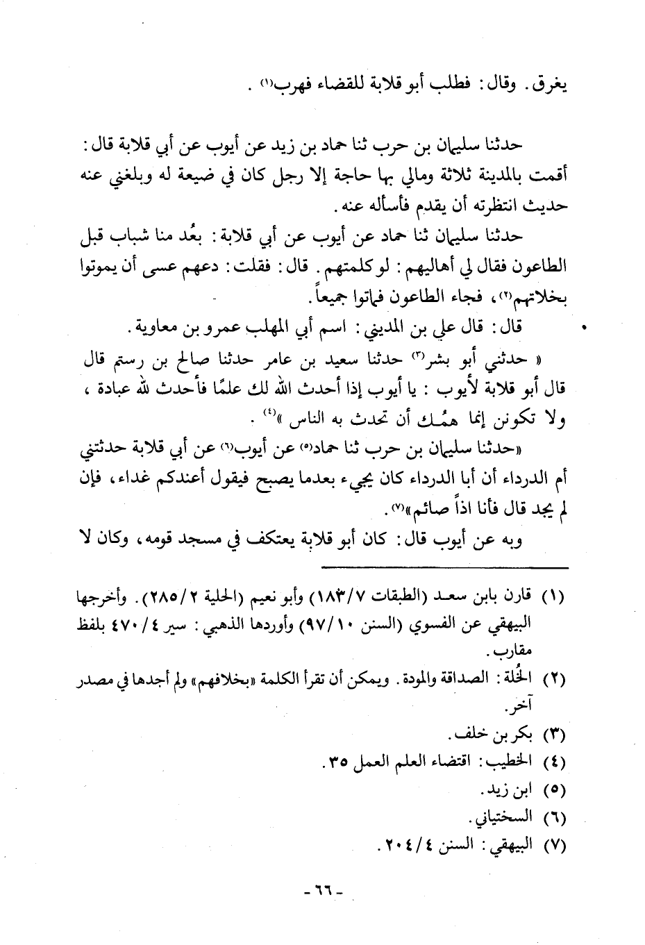حدثنا سليمان ثَنَا حَمَّادٌ عَنْ أَيُّوبَ عَنْ أَبِي قِلَابَةَ: بَعُدَ مِنَّا شَبَابٌ قَبْلَ الطَّاعُونِ فَقَالَ لِي أَهَالِيهُمْ: لَوْ كَلَّمْتَهُمْ. قَالَ: فَقُلْتُ: دَعْهُمْ عَسَى أَنْ يَمُوتُوا بِخَلَاتِهِمْ [2] ، فَجَاءَ الطَّاعُونُ فَمَاتُوا جَمِيعًا.