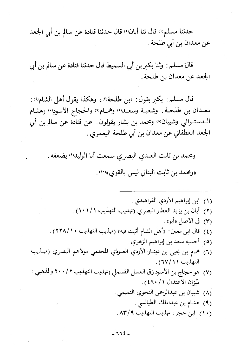 قَالَ مُسْلِمٌ: بُكَيْرٌ يَقُولُ: ابْنُ طَلْحَةَ [3] ، وَهَكَذَا يَقُولُ أَهْلُ الشَّامِ [4] : مَعْدَانُ بْنُ طَلْحَةَ. وَشُعْبَةُ وَسَعْدٌ [5] وَهَمَّامٌ [6] وَالْحَجَّاجُ الْأَسْوَدُ [7] وَهِشَامٌ الدَّسْتُوَائِيُّ وَشَيْبَانُ [8] وَمُحَمَّدُ بْنُ بَشَّارٍ يَقُولُونَ: عَنْ قَتَادَةَ عَنْ سَالِمِ بْنِ أَبِي الْجَعْدِ الْغَطَفَانِيِّ عَنْ مَعْدَانَ بْنِ أَبِي طَلْحَةَ الْيَعْمُرِيِّ.