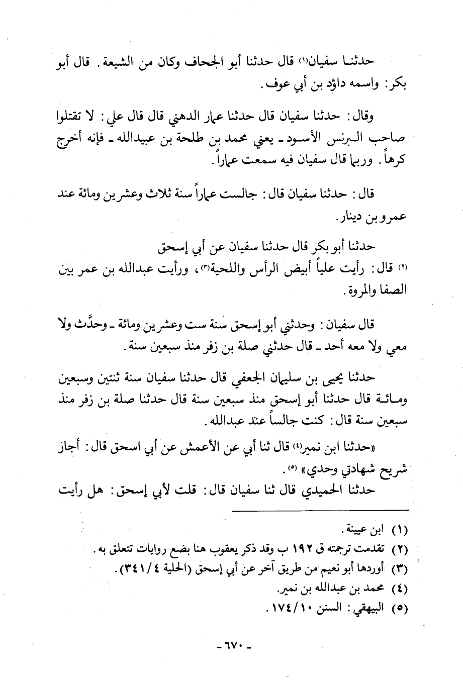 حدثنا يحي بْنُ سُلَيْمَانَ الْجُعْفِيُّ قَالَ حَدَّثَنَا سُفْيَانُ سَنَةَ ثِنْتَيْنِ وَسَبْعِينَ وَمِائَةٍ قَالَ حَدَّثَنَا أَبُو إِسْحَاقَ مُنْذُ سَبْعِينَ سَنَةً قَالَ حَدَّثَنَا صِلَةُ بْنُ زُفَرَ مُنْذُ سَبْعِينَ سَنَةً قَالَ: كُنْتُ جَالِسًا عِنْدَ عَبْدِ اللَّهِ.