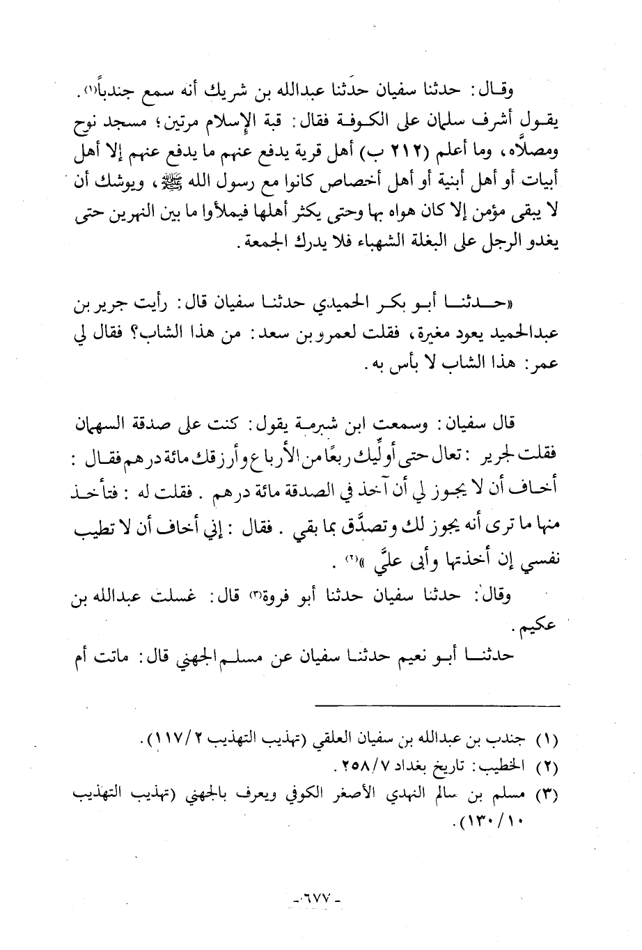 «حَدَّثَنَا أَبُو بَكْرٍ الْحُمَيْدِيُّ حَدَّثَنَا سُفْيَانُ قَالَ: رَأَيْتُ جَرِيرَ بْنَ عَبْدِ الْحَمِيدِ يَعُودُ مُغِيرَةَ، فَقُلْتُ لِعَمْرِو بْنِ سَعْدٍ: مَنْ هَذَا الشَّابُّ؟ فَقَالَ لِي عُمَرُ: هَذَا الشَّابّ لَا بَأْسَ بِهِ.