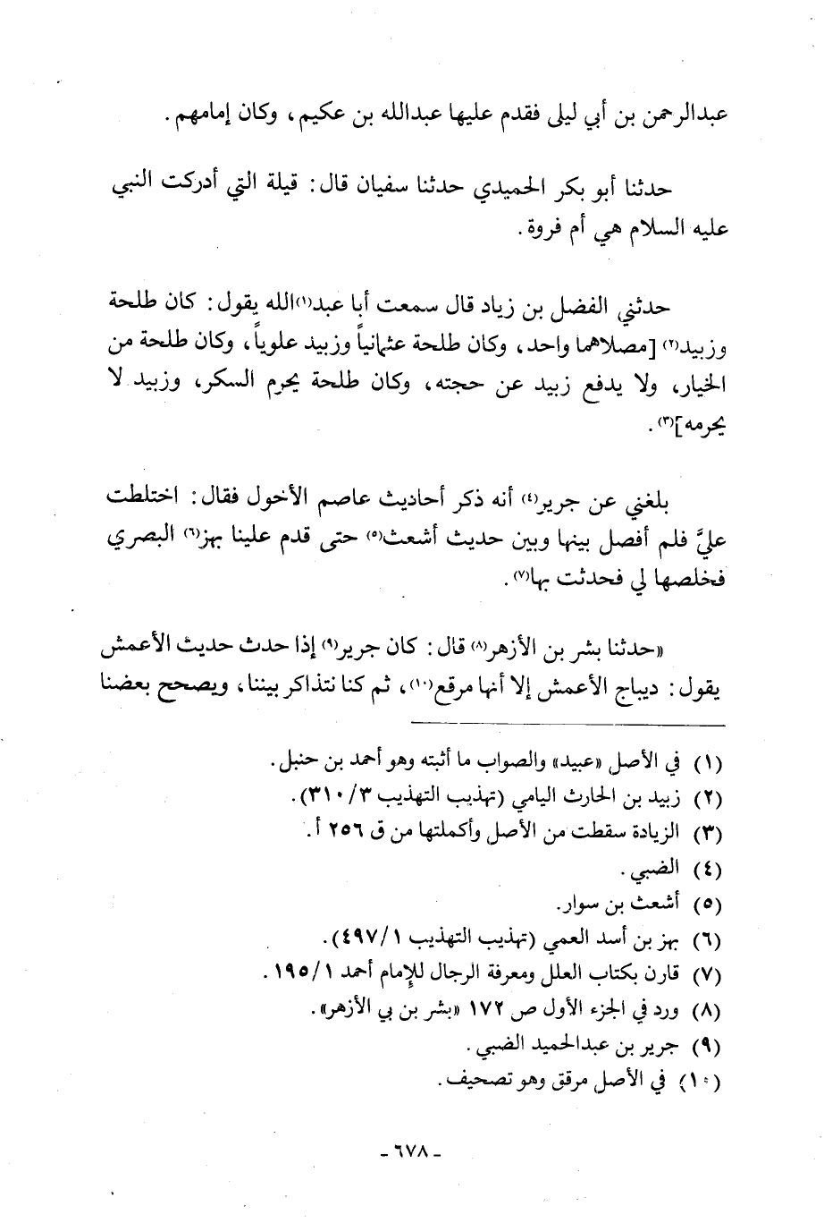 حَدَّثَنِي الْفَضْلُ بْنُ زِيَادٍ قَالَ سَمِعْتُ أبا عبد [1] الله يقول: كان طلحة وزبيد [2] [مُصَلَّاهُمَا وَاحِدٌ، وَكَانَ طَلْحَةُ عُثْمَانِيًّا وَزُبَيْدٌ عَلَوِيًّا، وَكَانَ طَلْحَةُ مِنَ الْخِيَارِ، وَلَا يَدْفَعُ زُبَيْدٌ عَنْ حُجَّتِهِ، وَكَانَ طَلْحَةُ يُحَرِّمُ السُّكْرَ، وَزُبَيْدٌ لَا يُحَرِّمُهُ] [3] .