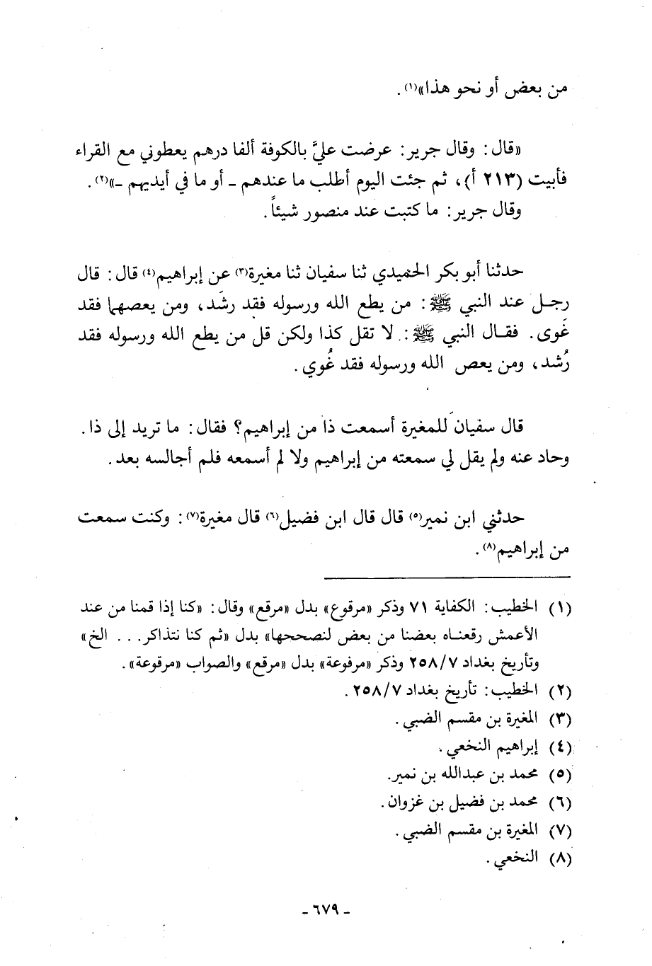 حَدَّثَنَا أَبُو بَكْرٍ الْحُمَيْدِيُّ ثنا سُفْيَانُ ثنا مُغِيرَةُ [3] عَنْ إِبْرَاهِيمَ [4] قَالَ: قَالَ رَجُلٌ عِنْدَ النَّبِيِّ صَلَّى اللَّهُ عَلَيْهِ وَسَلَّمَ: مَنْ يُطِعِ اللَّهَ وَرَسُولَهُ فَقَدْ رَشَدَ، وَمَنْ يَعْصِهِمَا فَقَدْ غَوَى. فَقَالَ النَّبِيُّ صَلَّى اللَّهُ عَلَيْهِ وَسَلَّمَ: لَا تَقُلْ كَذَا وَلَكِنْ قل مَنْ يُطِعِ اللَّهَ وَرَسُولَهُ فَقَدْ رَشَدَ، وَمَنْ يَعْصِ اللَّهَ وَرَسُولَهُ فَقَدْ غَوَى. قَالَ سُفْيَانُ لِلْمُغِيرَةِ أَسَمِعْتَ ذَا مِنْ إِبْرَاهِيمَ؟ فَقَالَ: مَا تُرِيدُ إِلَى ذَا.