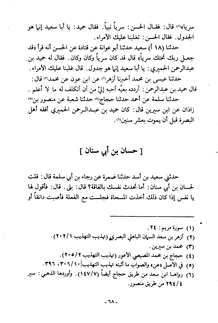 حَدَّثَنَا سَلَمَةُ عَنْ أَحْمَدَ حَدَّثَنَا حَجَّاجٌ [4] حَدَّثَنَا شُعْبَةُ عَنْ مَنْصُورِ بْنِ [5] زَاذَانَ عَنِ ابْنِ سِيرِينَ قَالَ: كَانَ حُمَيْدُ بْنُ عَبْدِ الرَّحْمَنِ الْحِمْيَرِيِّ أَفْقَهَ أَهْلِ الْبَصْرَةِ قَبْلَ أَنْ يَمُوتَ بِعَشْرِ سِنِينَ [6] .