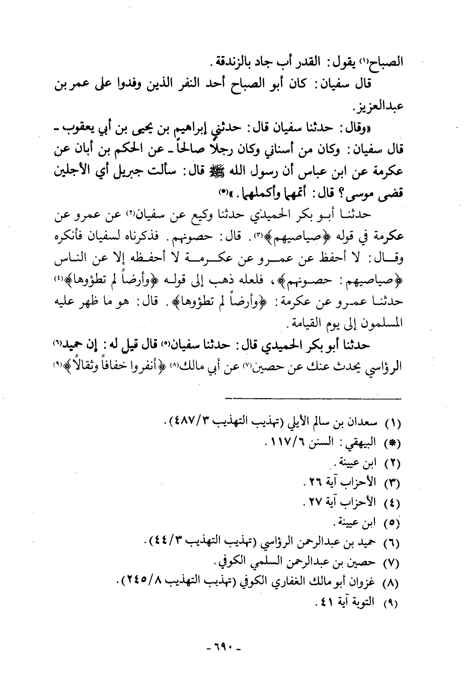 حَدَّثَنَا أَبُو بَكْرٍ الْحُمَيْدِيُّ قَالَ: حدثنا سفيان [5] قال قيل له: ان حميد [6] الرُّؤَاسِيَّ يُحَدِّثُ عَنْكَ عَنْ حُصَيْنٍ [7] عَنْ أَبِي مالك [8] «انفروا