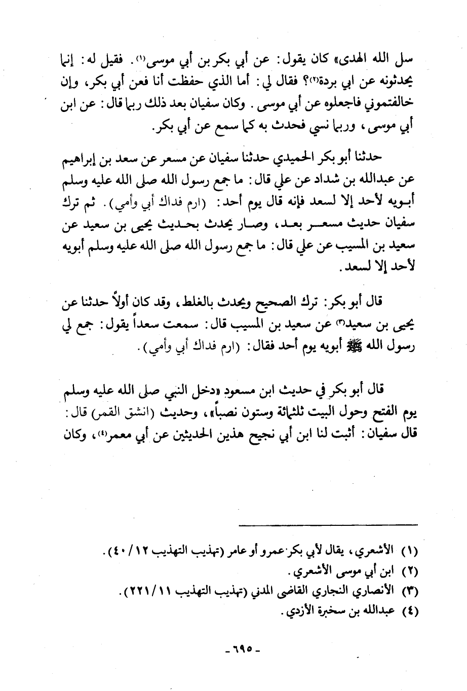 حَدَّثَنَا أَبُو بَكْرٍ الْحُمَيْدِيُّ حَدَّثَنَا سُفْيَانُ عَنْ مِسْعَرٍ عَنْ سَعْدِ بْنِ إِبْرَاهِيمَ عَنْ عَبْدِ اللَّهِ بْنِ شَدَّادٍ عَنْ عَلِيٍّ قَالَ: مَا جَمَعَ رَسُولُ اللَّهِ صَلَّى اللَّهُ عَلَيْهِ وَسَلَّمَ أَبَوَيْهِ لِأَحَدٍ إِلَّا لِسَعْدٍ فَإِنَّهُ قَالَ يَوْمَ أُحُدٍ: «ارْمِ فِدَاكَ أَبِي وَأُمِّي» . ثُمَّ تَرَكَ سُفْيَانُ حَدِيثَ مِسْعَرٍ بَعْدُ، وَصَارَ يُحَدِّثُ بحديث يحي بن سعيد عن سعيد بن المسيب عن عَلِيٍّ قَالَ: مَا جَمَعَ رَسُولُ اللَّهِ صَلَّى اللَّهُ عَلَيْهِ وَسَلَّمَ أَبَوَيْهِ لِأَحَدٍ إِلَّا لِسَعْدٍ. قَالَ أَبُو بَكْرٍ: تَرَكَ الصَّحِيحَ وَيُحَدِّثُ بِالْغَلَطِ، وقد كان أولا حدثنا عن يحي بْنِ سَعِيدٍ [3] عَنْ سَعِيدِ بْنِ الْمُسَيِّبِ قَالَ: سَمِعْتُ سَعْدًا يَقُولُ: جَمَعَ لِي رَسُولُ اللَّهِ صَلَّى اللَّهُ عَلَيْهِ وَسَلَّمَ أَبَوَيْهِ يَوْمَ أُحُدٍ فَقَالَ: «ارْمِ فِدَاكَ أَبِي وَأُمِّي» . قَالَ أَبُو بَكْرٍ فِي حَدِيثِ ابْنِ مَسْعُودٍ «دَخَلَ النَّبِيُّ صلى الله عليه وسلم يوم الفتح وحول البيت ثلاثمائة وستون نَصَبًا» ، وَحَدِيثُ «انْشَقَّ الْقَمَرُ» قَالَ: قَالَ سُفْيَانُ: أَثْبَتَ لَنَا ابْنُ أَبِي نَجِيحٍ هَذَيْنِ الْحَدِيثَيْنِ عن أبي معمر [4] ،