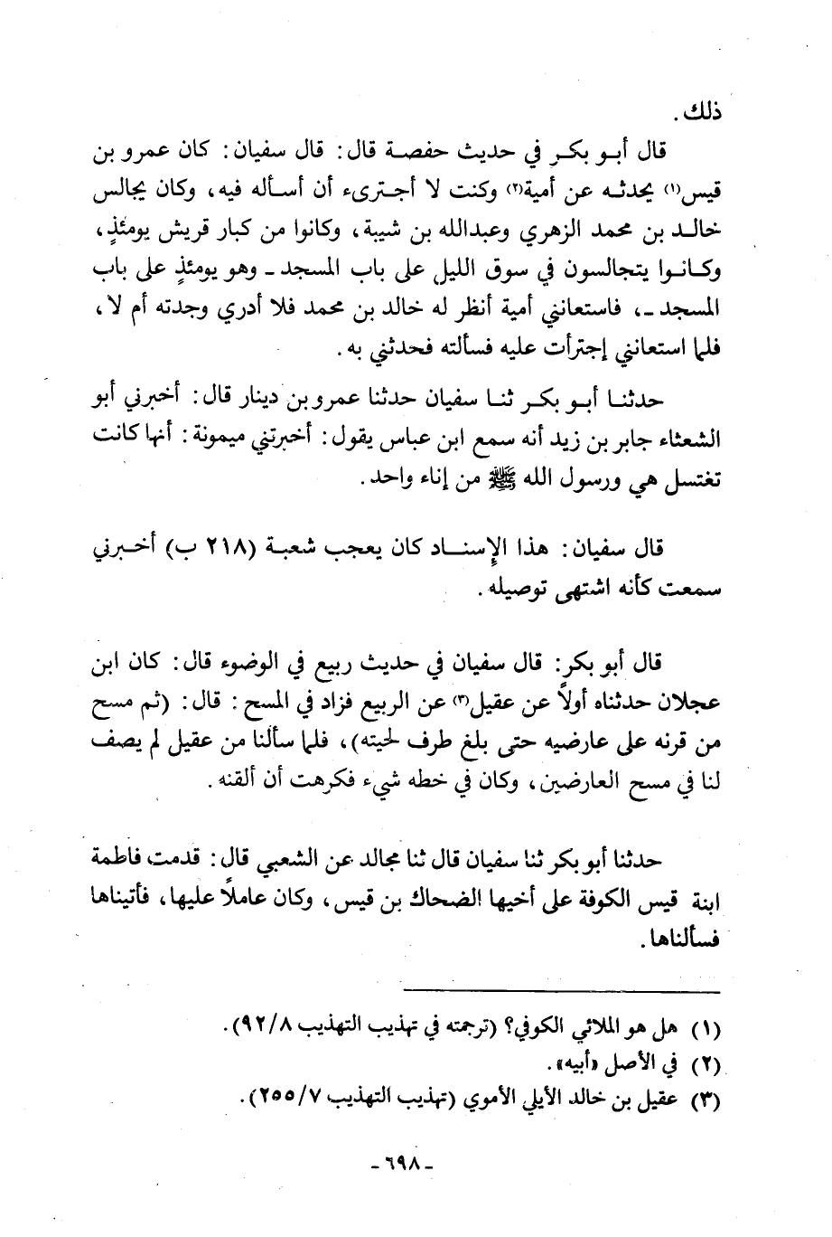 قَالَ أَبُو بَكْرٍ فِي حَدِيثِ حَفْصَةَ قَالَ: قَالَ سُفْيَانُ: كَانَ عَمْرُو بْنُ قَيْسٍ [1] يُحَدِّثُهُ عَنْ أُمَيَّةَ [2] وَكُنْتُ لَا أَجْتَرِئُ أَنْ أَسْأَلَهُ فِيهِ، وَكَانَ يُجَالِسُ خَالِدَ بْنَ مُحَمَّدٍ الزُّهْرِيَّ وَعَبْدَ اللَّهِ بْنَ شَيْبَةَ، وَكَانُوا مِنْ كِبَارِ قُرَيْشٍ يَوْمَئِذٍ، وَكَانُوا يَتَجَالَسُونَ فِي سُوقِ اللَّيْلِ عَلَى بَابِ الْمَسْجِدِ- وَهُوَ يَوْمَئِذٍ عَلَى بَابِ الْمَسْجِدِ-، فَاسْتَعَانَنِي أُمَيَّةُ أَنْظُرُ لَهُ خَالِدَ بْنَ مُحَمَّدٍ فَلَا أَدْرِي وَجَدْتُهُ أَمْ لَا، فَلَمَّا اسْتَعَانَنِي اجْتَرَأْتُ عَلَيْهِ فَسَأَلْتُهُ فَحَدَّثَنِي بِهِ.