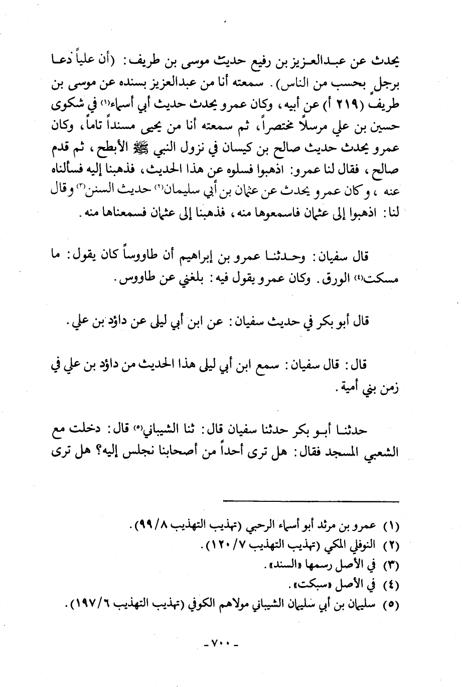 عَمْرٌو يُحَدِّثُ عَنْ عَبْدِ الْعَزِيزِ بْنِ رَفِيعٍ حَدِيثَ مُوسَى بْنِ طَرِيفٍ: «أَنَّ عَلِيًّا دَعَا بِرَجُلٍ بِحَسَبٍ مِنَ النَّاسِ» . سَمِعْتُهُ أَنَا مِنْ عبد العزيز بسنده عن موسى بن طريف (219 أ) عَنْ أَبِيهِ، وَكَانَ عَمْرٌو يُحَدِّثُ حَدِيثَ أَبِي أَسْمَاءَ [1] فِي شَكْوَى حُسَيْنِ بْنِ عَلِيٍّ مُرْسَلًا مختصرا، ثم سمعته أنا من يحي مُسْنَدًا تَامًّا، وَكَانَ عَمْرٌو يُحَدِّثُ حَدِيثَ صَالِحِ بْنِ كِيسَانَ فِي نُزُولِ النَّبِيِّ صَلَّى اللَّهُ عَلَيْهِ وَسَلَّمَ الْأَبْطَحَ، ثُمَّ قَدِمَ صَالِحٌ، فَقَالَ لَنَا عَمْرٌو: اذْهَبُوا فَسَلُوهُ عَنْ هَذَا الْحَدِيثِ، فذهبنا اليه فسألناه عن، وَكَانَ عَمْرٌو يُحَدِّثُ عَنْ عُثْمَانَ بْنِ أَبِي سُلَيْمَانَ [2] حَدِيثَ السَّنَدِ [3] وَقَالَ لَنَا: اذْهَبُوا إِلَى عُثْمَانَ فَاسْمَعُوهَا مِنْهُ، فَذَهَبْنَا إِلَى عُثْمَانَ فَسَمِعْنَاهَا مِنْهُ.