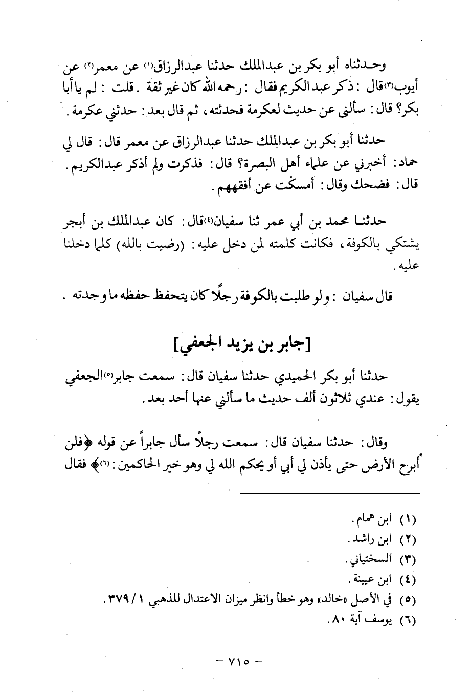 حَدَّثَنَا أَبُو بَكْرٍ الْحُمَيْدِيُّ حَدَّثَنَا سُفْيَانُ قَالَ: سَمِعْتُ جَابِرَ [5] الْجُعْفِيَّ يَقُولُ: عِنْدِي ثَلَاثُونَ أَلْفَ حَدِيثٍ مَا سَأَلَنِي عَنْهَا أَحَدٌ بَعْدُ.