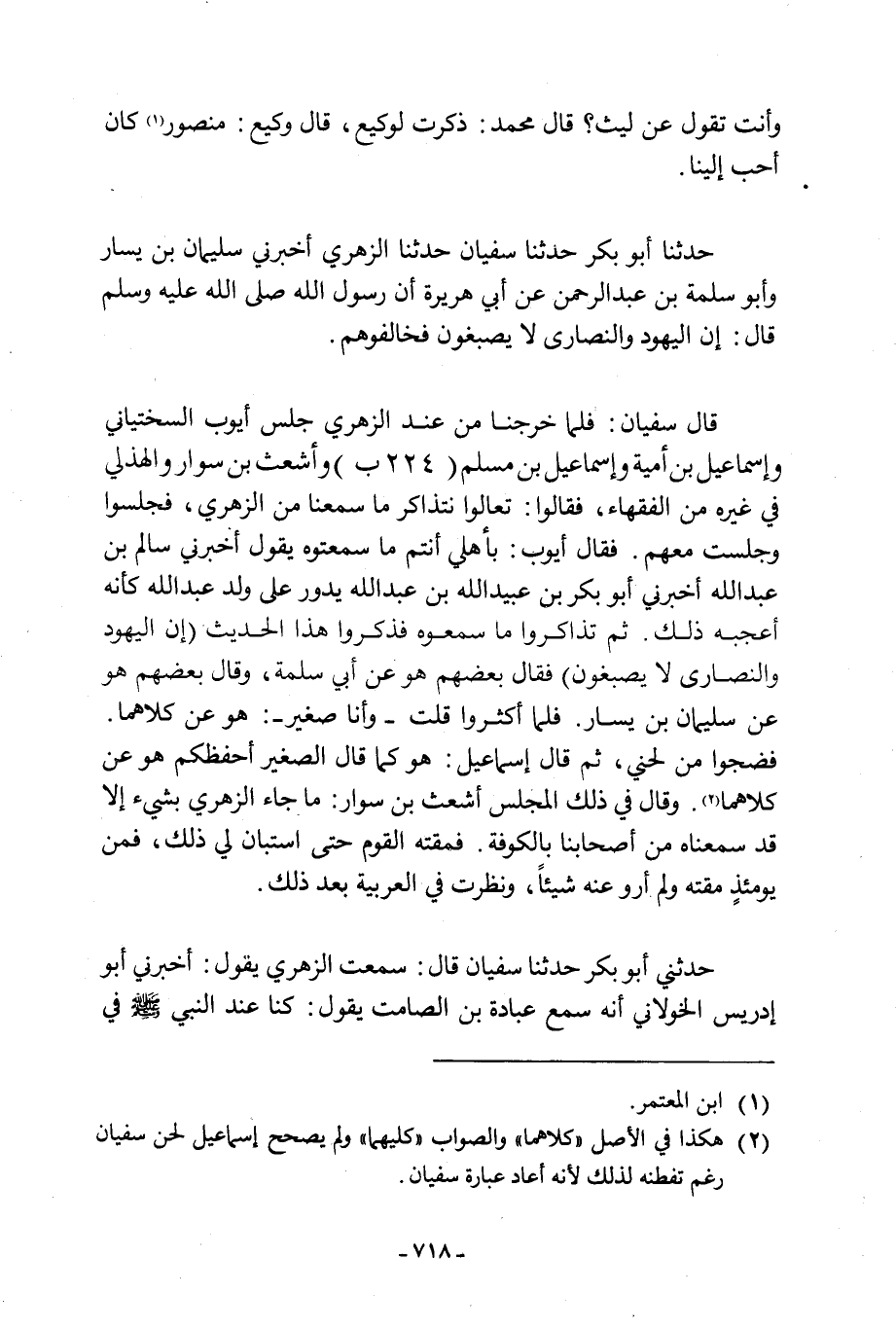 حَدَّثَنَا أَبُو بَكْرٍ حَدَّثَنَا سُفْيَانُ حَدَّثَنَا الزُّهْرِيُّ أَخْبَرَنِي سُلَيْمَانُ بْنُ يَسَارٍ وَأَبُو سَلَمَةَ بْنُ عَبْدِ الرَّحْمَنِ عَنْ أَبِي هُرَيْرَةَ أَنّ رسول الله صلى الله عليه وسلم قال: إِنَّ الْيَهُودَ وَالنَّصَارَى لَا يَصْبُغُونَ فَخَالِفُوهُمْ. قَالَ سُفْيَانُ: فَلَمَّا خَرَجْنَا مِنْ عِنْدِ الزُّهْرِيِّ جَلَسَ أَيُّوبُ السَّخْتِيَانِيُّ وَإِسْمَاعِيلُ بْنُ أُمَيَّةَ وَإِسْمَاعِيلُ بْنُ مسلم (224 ب) وَأَشْعَثُ بْنُ سِوَارٍ الْهُذَلِيُّ فِي غَيْرِهِ مِنَ الْفُقَهَاءِ، فَقَالُوا: تَعَالَوْا نَتَذَاكَرُ مَا سَمِعْنَا مِنَ الزُّهْرِيِّ، فَجَلَسُوا وَجَلَسْتُ مَعَهُمْ. فَقَالَ أَيُّوبُ: بِأَهْلِي أَنْتُمْ مَا سَمِعْتُمُوهُ يَقُولُ أَخْبَرَنِي سَالِمُ بْنُ عَبْدِ اللَّهِ أَخْبَرَنِي أَبُو بَكْرِ بْنُ عُبَيْدِ اللَّهِ بْنِ عَبْدِ اللَّهِ يَدُورُ عَلَى وَلَدِ عَبْدِ اللَّهِ كَأَنَّهُ أَعْجَبَهُ ذَلِكَ. ثُمَّ تَذَاكَرُوا مَا سَمِعُوهُ فَذَكَرُوا هَذَا الْحَدِيثَ «إِنَّ الْيَهُودَ وَالنَّصَارَى لَا يَصْبُغُونَ» فَقَالَ بَعْضُهُمْ هُوَ عَنْ أَبِي سَلَمَةَ، وَقَالَ بَعْضُهُمْ هُوَ عَنْ سُلَيْمَانَ ابن يَسَارٍ. فَلَمَّا أَكْثَرُوا قُلْتُ- وَأَنَا صَغِيرٌ-: هُوَ عَنْ كِلَاهُمَا. فَضَجُّوا مِنْ لَحْنِي، ثُمَّ قَالَ إِسْمَاعِيلُ: هُوَ كَمَا قَالَ الصَّغِيرُ أَحْفَظُكُمْ هُوَ عَنْ كِلَاهُمَا [2] . وَقَالَ فِي ذَلِكَ الْمَجْلِسِ أَشْعَثُ بْنُ سِوَارٍ: مَا جَاءَ الزُّهْرِيَّ شَيْءٌ إِلَّا قَدْ سَمِعْنَاهُ مِنْ أَصْحَابِنَا بِالْكُوفَةِ. فَمَقَتَهُ الْقَوْمُ حَتَّى اسْتَبَانَ لِي ذَلِكَ، فَمِنْ يَوْمِئِذٍ مَقَتُّهُ فَلَمْ أَرْوِ عَنْهُ شَيْئًا، وَنَظَرْتُ فِي الْعَرَبِيَّةِ بَعْدَ ذَلِكَ.