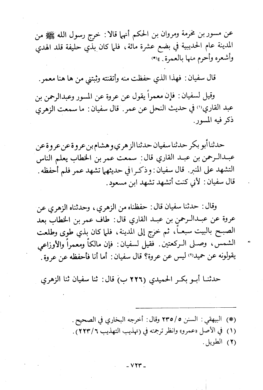 وَقَالَ: حدثنا سفيان قال: حفظناه من الزهري، وحدثناه الزُّهْرِيُّ عَنْ عُرْوَةَ عَنْ عَبْدِ الرَّحْمَنِ بْنِ عَبْدِ الْقَارِيِّ قَالَ: طَافَ عُمَرُ بْنُ الْخَطَّابِ بَعْدَ الصُّبْحِ بِالْبَيْتِ سَبْعًا، ثُمَّ خَرَجَ إِلَى الْمَدِينَةِ، فَلَمَّا كَانَ بِذِي طُوَى وَطَلَعَتِ الشَّمْسُ، وَصَلَّى الرَّكْعَتَيْنِ. فَقِيلَ لِسُفْيَانَ: فَإِنَّ مَالِكًا وَمَعْمَرًا وَالْأَوْزَاعِيَّ يَقُولُونَهُ عَنْ حُمَيْدٍ [2] لَيْسَ عَنْ عُرْوَةَ؟ قَالَ سُفْيَانُ: أَمَّا أَنَا فَأَحْفَظُهُ عَنْ عُرْوَةَ.