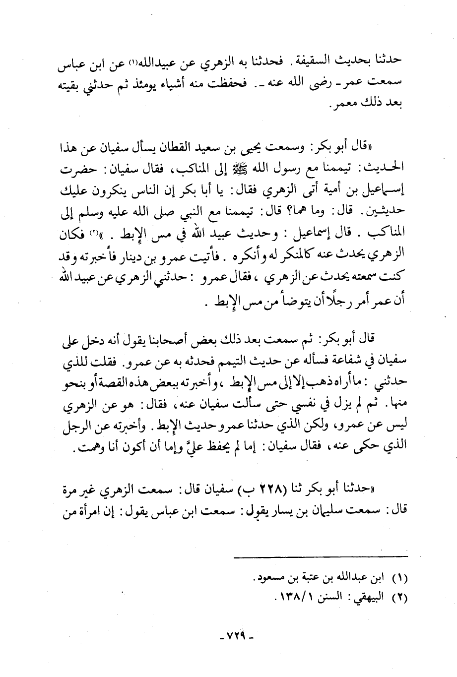 قال ابو بكر: وسمعت يحي بْنَ سَعِيدٍ الْقَطَّانَ يَسْأَلُ سُفْيَانَ عَنْ هَذَا الْحَدِيثِ: تَيَمَّمْنَا مَعَ رَسُولِ اللَّهِ صَلَّى اللَّهُ عَلَيْهِ وَسَلَّمَ إِلَى الْمَنَاكِبِ، فَقَالَ سُفْيَانُ: حَضَرْتُ إِسْمَاعِيلَ بْنَ أُمَيَّةَ أَتَى الزُّهْرِيَّ فَقَالَ: يَا أَبَا بَكْرٍ إِنَّ النَّاسَ يُنْكِرُونَ عَلَيْكَ حَدِيثَيْنِ. قَالَ: وَمَا هُمَا؟ قَالَ: تَيَمَّمْنَا مَعَ النَّبِيِّ صَلَّى اللَّهُ عَلَيْهِ وَسَلَّمَ إِلَى الْمَنَاكِبِ. قَالَ إِسْمَاعِيلَ: وَحَدِيثُ عُبَيْدِ اللَّهِ فِي مَسِّ الْإِبِطِ.