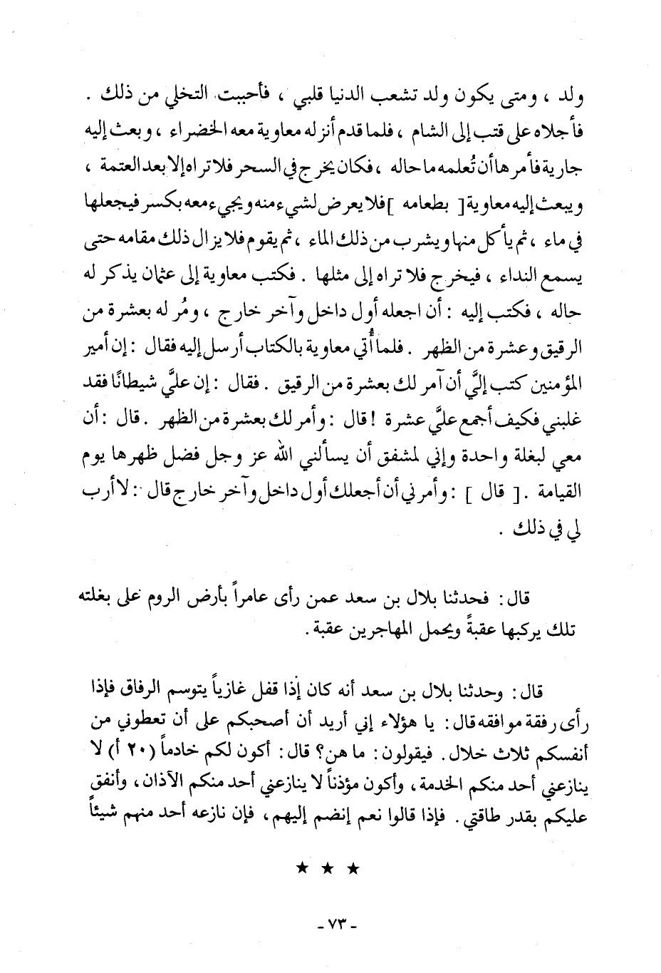 قَالَ: وَحَدَّثَنَا بِلَالُ بْنُ سَعْدٍ أَنَّهُ كَانَ إِذَا قَفَلَ غَازِيًا يَتَوَسَّمُ الرِّفَاقَ فَإِذَا رَأَى رِفْقَةً تُوَافِقُهُ قَالَ: يَا هَؤُلَاءِ إِنِّي أُرِيدُ أَنْ أَصْحَبَكُمْ عَلَى أَنْ تُعْطُونِي مِنْ أَنْفُسِكُمْ ثَلَاثَ خِلَالٍ. فَيَقُولُونَ: ما هن؟ قال: أكون لكم خادما (20 أ) لَا يُنَازِعُنِي أَحَدٌ مِنْكُمُ الْخِدْمَةَ، وَأَكُونُ مُؤَذِّنًا لَا يُنَازِعُنِي أَحَدٌ مِنْكُمُ الْأَذَانَ، وَأُنْفِقُ عَلَيْكُمْ بِقَدْرِ طَاقَتِي. فَإِذَا قَالُوا نَعَمَ انْضَمَّ إِلَيْهِمْ، فَإِنْ نَازَعَهُ أَحَدٌ