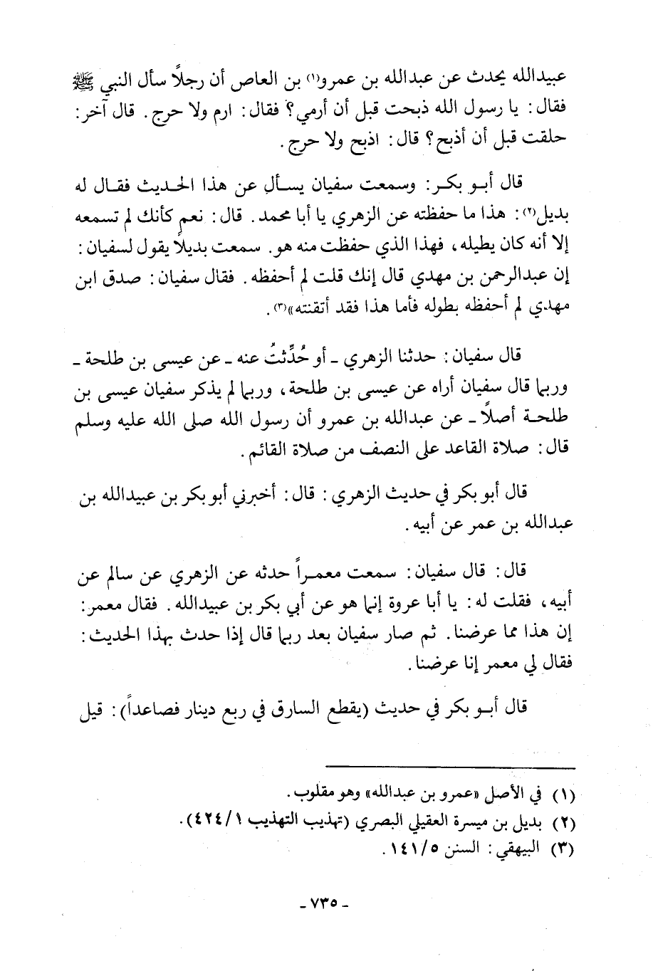 هَذَا مَا حَفِظْتُهُ عَنِ الزُّهْرِيِّ يَا أَبَا مُحَمَّدٍ. قَالَ: نَعَمْ كَأَنَّكَ لَمْ تَسْمَعْهُ الا انه كان يطليه، فَهَذَا الَّذِي حَفِظْتُ مِنْهُ هُوَ. سَمِعْتُ بُدَيْلًا يَقُولُ لِسُفْيَانَ: إِنَّ عَبْدَ الرَّحْمَنِ بْنَ مَهْدِيٍّ قَالَ إِنَّكَ قُلْتُ لَمْ أَحْفَظْهُ. فَقَالَ سُفْيَانُ: صَدَقَ ابْنُ مَهْدِيٍّ لَمْ أَحْفَظْهُ بِطُولِهِ فَأَمَّا هَذَا فَقَدْ أَتْقَنْتُهُ.