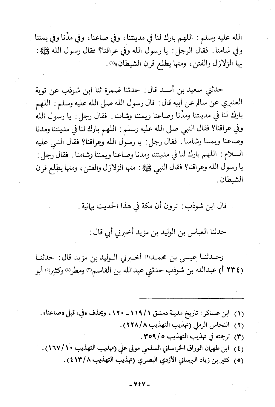 صَلَّى اللَّهُ عَلَيْهِ وَسَلَّمَ: اللَّهمّ بَارِكْ لَنَا فِي مَدِينَتِنَا، وَفِي صَاعِنَا، وَفِي مُدِّنَا وَفِي يَمَنِنَا وَفِي شَامِنَا. فَقَالَ الرَّجُلُ: يَا رَسُولَ اللَّهِ وَفِي عِرَاقِنَا؟ فَقَالَ رَسُولُ اللَّهِ صَلَّى اللَّهُ عَلَيْهِ وَسَلَّمَ: بِهَا الزَّلَازِلُ وَالْفِتَنُ، وَمِنْهَا يَطْلُعُ قَرْنُ الشَّيْطَانِ» [1] . حَدَّثَنِي سَعِيدُ بْنُ أَسَدٍ قَالَ: حَدَّثَنَا ضَمْرَةُ ثنا ابْنُ شَوْذَبَ عَنْ تَوْبَةَ الْعَنْبَرِيِّ عَنْ سَالِمٍ عَنْ أَبِيهِ قَالَ: قَالَ رَسُولُ اللَّهِ صَلَّى اللَّهُ عَلَيْهِ وَسَلَّمَ: اللَّهمّ بَارِكْ لَنَا فِي مَدِينَتِنَا وَمُدِّنَا وَصَاعِنَا وَيَمَنِنَا وَشَامِنَا. فَقَالَ رَجُلٌ: يَا رَسُولَ اللَّهِ وفي عراقنا؟ فقال النبي صَلَّى اللَّهُ عَلَيْهِ وَسَلَّمَ: اللَّهمّ بَارِكْ لَنَا فِي مَدِينَتِنَا وَمُدِّنَا وَصَاعِنَا وَيَمَنِنَا وَشَامِنَا. فَقَالَ رجل: يا رسول الله وعراقنا؟ فقال النبي عليه السلام: اللَّهمّ بَارِكْ لَنَا فِي مَدِينَتِنَا وَمُدِّنَا وَصَاعِنَا وَيَمَنِنَا وَشَامِنَا. فَقَالَ رَجُلٌ: يَا رَسُولَ اللَّهِ وعراقنا؟ فقال النبي صلى الله عليه وسلم: منها الزَّلَازِلُ وَالْفِتَنُ، وَمِنْهَا يَطْلُعُ قَرْنُ الشَّيْطَانِ. قَالَ ابْنُ شَوْذَبَ: تَرَوْنَ أَنَّ مَكَّةَ فِي هَذَا الْحَدِيثِ يَمَانِيَّةٌ.