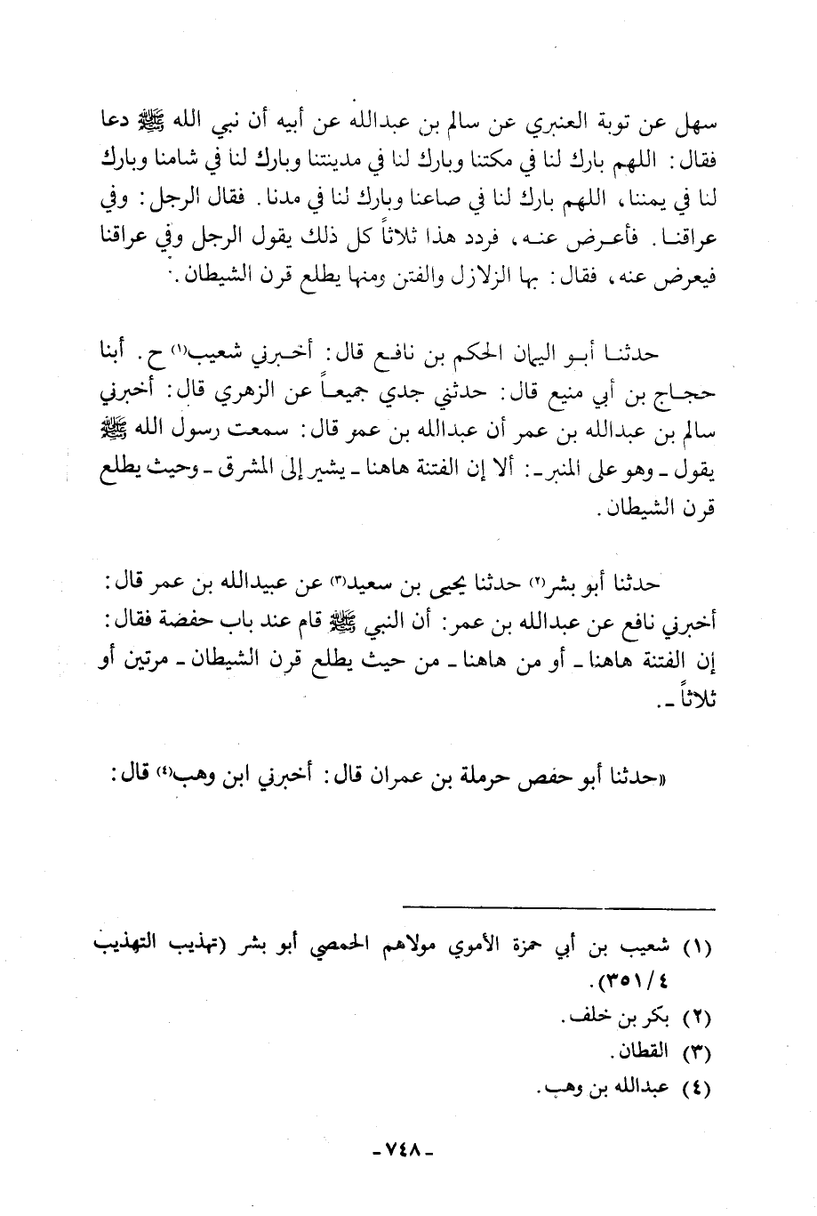 أَخْبَرَنِي نَافِعٌ عَنْ عَبْدِ اللَّهِ بْنِ عُمَرَ: أَنّ النَّبِيَّ صَلَّى اللَّهُ عَلَيْهِ وَسَلَّمَ قَامَ عِنْدَ بَابِ حَفْصَةَ فَقَالَ: إِنَّ الْفِتْنَةَ هَاهُنَا- أَوْ مِنْ هَاهُنَا- مِنْ حَيْثُ يَطْلُعُ قَرْنُ الشَّيْطَانِ- مَرَّتَيْنِ أَوْ ثَلَاثًا-. «حَدَّثَنَا أَبُو حَفْصٍ حَرْمَلَةُ بْنُ عِمْرَانَ قَالَ: أَخْبَرَنِي ابْنُ وهب [4]