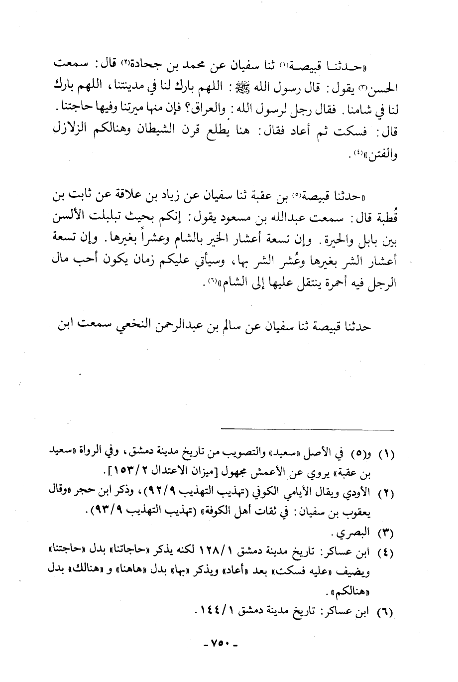 «حَدَّثَنَا قَبِيصَةُ [1] ثنا سُفْيَانُ عَنْ مُحَمَّدِ بْنِ جُحَادَةَ [2] قَالَ: سَمِعْتُ الْحَسَنَ [3] يَقُولُ: قَالَ رَسُولُ اللَّهِ صَلَّى اللَّهُ عَلَيْهِ وَسَلَّمَ: اللَّهمّ بَارِكْ لَنَا فِي مَدِينَتِنَا، اللَّهمّ بَارِكْ لَنَا فِي شَامِنَا. فَقَالَ رَجُلٌ لِرَسُولِ اللَّهِ: وَالْعِرَاقُ؟ فَإِنَّ مِنْهَا مِيرَتَنَا وَفِيهَا حَاجَتَنَا. قَالَ: فَسَكَتَ ثُمَّ أعاد فقال: هنا يطلع قرن الشيطان وهنالكم الزَّلَازِلُ وَالْفِتَنُ» [4] . «حَدَّثَنَا قَبِيصَةُ [5] بْنُ عُقْبَةَ ثنا سُفْيَانُ عَنْ زِيَادِ بْنِ عِلَاقَةَ عَنْ ثَابِتِ بْنِ قُطْبَةَ قَالَ: سَمِعْتُ عَبْدَ اللَّهِ بْنَ مَسْعُودٍ يَقُولُ: إِنَّكُمْ بِحَيْثُ تَبَلْبَلَتِ الْأَلْسُنُ بَيْنَ بَابِلٍ وَالْحِيرَةِ. وَإِنَّ تِسْعَةَ أَعْشَارِ الْخَيْرِ بِالشَّامِ وَعُشُرًا بِغَيْرِهَا. وَإِنَّ تِسْعَةَ أَعْشَارِ الشَّرِّ بِغَيْرِهَا وَعُشُرَ الشَّرِّ بِهَا، وَسَيَأْتِي عَلَيْكُمْ زَمَانٌ يَكُونُ أَحَبُّ مَالِ الرَّجُلِ فِيهِ أَحْمِرَةٌ يَنْتَقِلُ عَلَيْهَا إِلَى الشَّامِ» [6] .