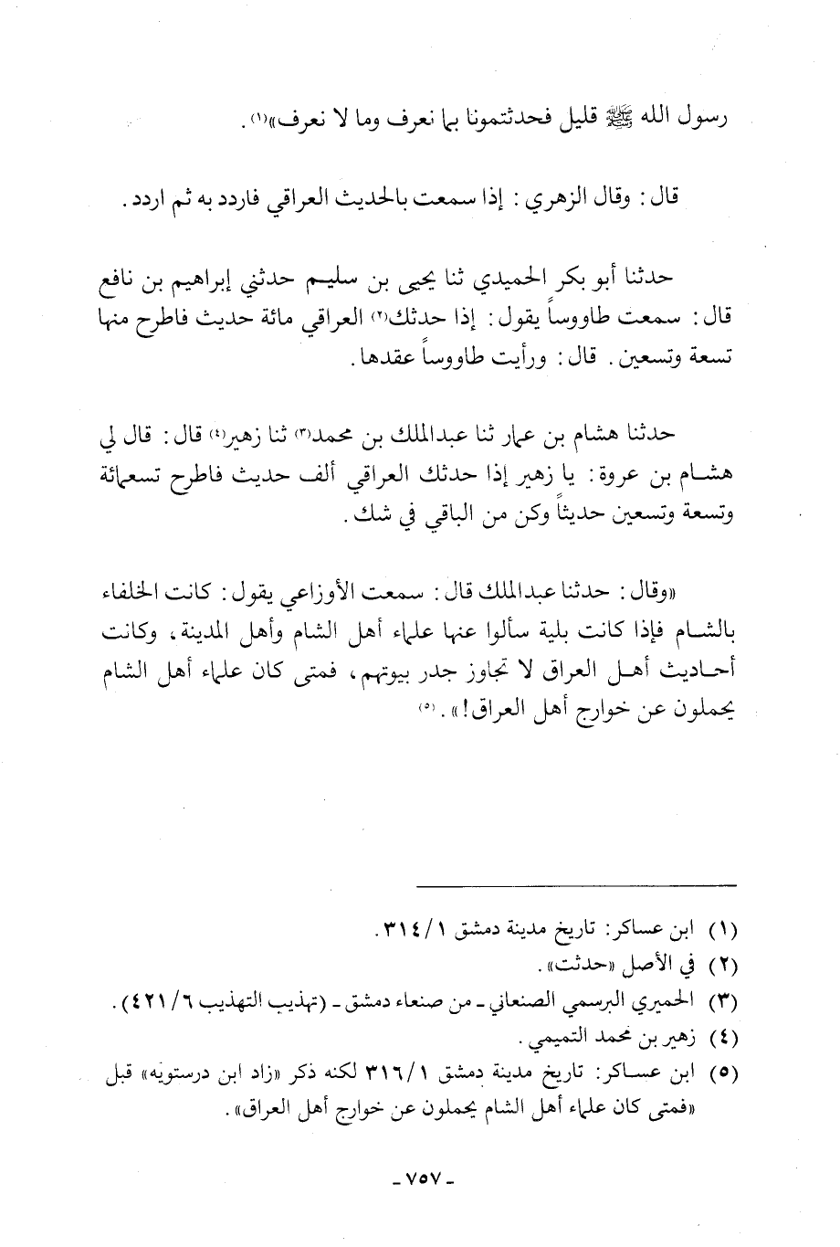 «وَقَالَ: حَدَّثَنَا عَبْدُ الْمَلِكِ قَالَ: سَمِعْتُ الْأَوْزَاعِيَّ يَقُولُ: كَانَتِ الْخُلَفَاءُ بِالشَّامِ فَإِذَا كَانَتْ بَلِيَّةٌ سَأَلُوا عَنْهَا عُلَمَاءَ أَهْلِ الشَّامِ وَأَهْلِ الْمَدِينَةِ، وَكَانَتْ أَحَادِيثُ أَهْلِ الْعِرَاقِ لَا تُجَاوِزُ جُدُرَ بُيُوتِهِمْ، فَمَتَى كَانَ عُلَمَاءُ أَهْلِ الشَّامِ يَحْمِلُونَ عَنْ خَوَارِجِ أَهْلِ الْعِرَاقِ!» . [5] «سَمِعْتُ الْحَسَنَ بْنَ الرَّبِيعِ قَالَ: سَمِعْتُ ابْنَ الْمُبَارَكِ يقول: ما رحلت