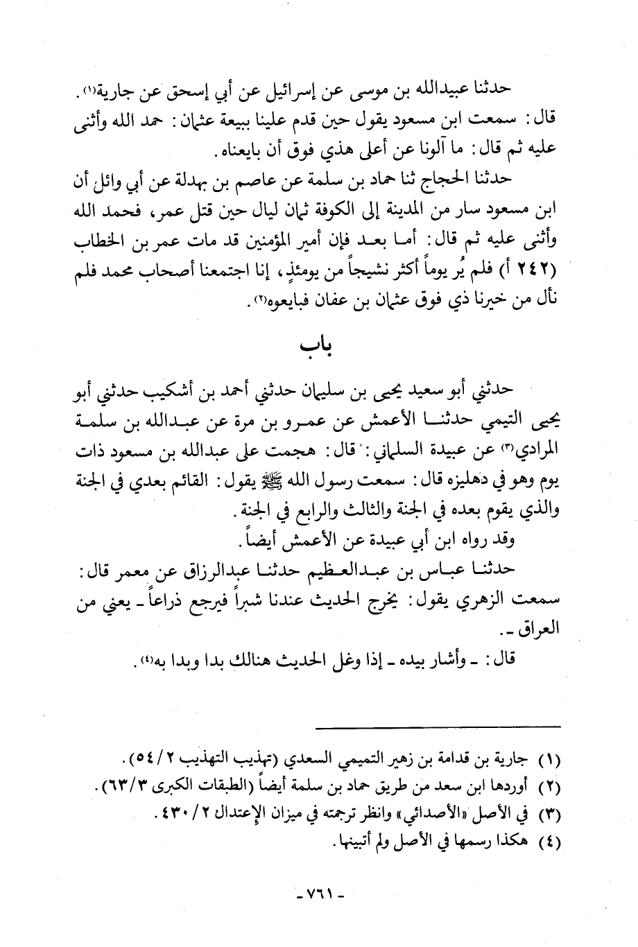 حدثني ابو سعيد يحي بْنُ سُلَيْمَانَ حَدَّثَنِي أَحْمَدُ بْنُ أَشْكِيبَ حَدَّثَنِي ابو يحي التَّيْمِيُّ حَدَّثَنَا الْأَعْمَشُ عَنْ عَمْرِو بْنِ مُرَّةَ عَنْ عَبْدِ اللَّهِ بْنِ سَلَمَةَ الْمُرَادِيِّ [3] عَنْ عُبَيْدَةَ السَّلْمَانِيِّ: قَالَ: هَجَمْتُ عَلَى عَبْدِ اللَّهِ بْنِ مَسْعُودٍ ذَاتَ يَوْمٍ وَهُوَ فِي دِهْلِيزِهِ قَالَ: سَمِعْتُ رَسُولَ اللَّهِ صَلَّى اللَّهُ عَلَيْهِ وَسَلَّمَ يَقُولُ: الْقَائِمُ بَعْدِي فِي الْجَنَّةِ وَالَّذِي يَقُومُ بَعْدَهُ فِي الْجَنَّةِ وَالثَّالِثُ وَالرَّابِعُ فِي الْجَنَّةِ.