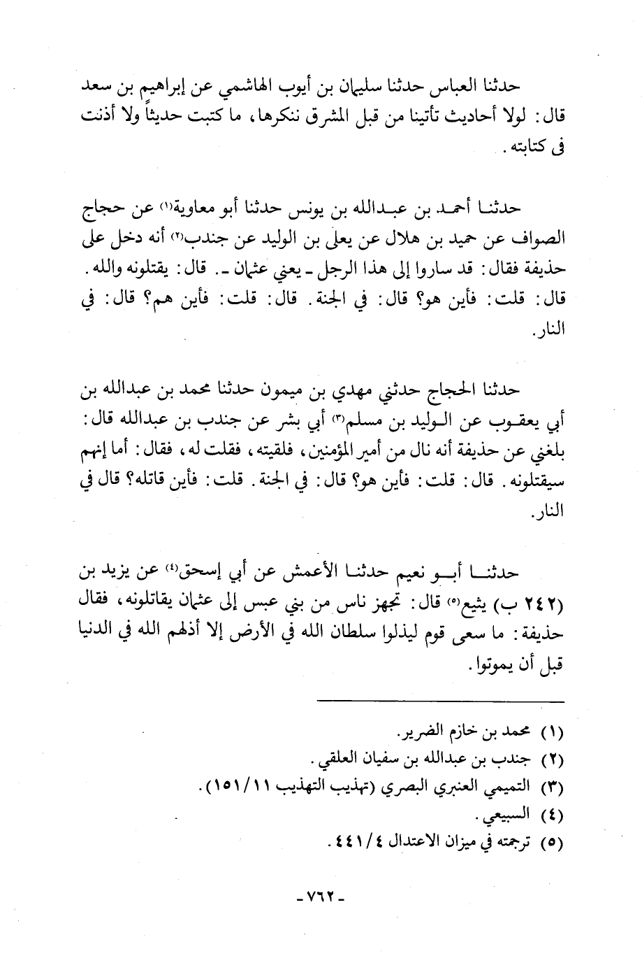 حَدَّثَنَا أَبُو نُعَيْمٍ حَدَّثَنَا الْأَعْمَشُ عَنْ أَبِي إِسْحَاقَ [4] عن يزيد بن (242 ب) يَثِيعَ [5] قَالَ: تَجَهَّزَ نَاسٌ مِنْ بَنِي عَبْسٍ إِلَى عُثْمَانَ يُقَاتِلُونَهُ، فَقَالَ حُذَيْفَةُ: مَا سَعَى قَوْمٌ لِيُذِلُّوا سُلْطَانَ اللَّهِ فِي الْأَرْضِ إِلَّا أَذَلَّهُمُ اللَّهُ فِي الدُّنْيَا قَبْلَ أَنْ يَمُوتُوا.