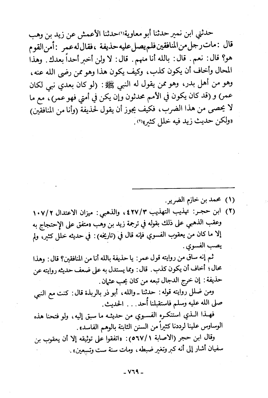 حَدَّثَنِي ابْنُ نُمَيْرٍ حَدَّثَنَا أَبُو مُعَاوِيَةَ [1] حَدَّثَنَا الْأَعْمَشُ عَنْ زَيْدِ بْنِ وَهْبٍ قَالَ: مَاتَ رَجُلٌ مِنَ الْمُنَافِقِينَ فَلَمْ يُصَلِّ عَلَيْهِ حُذَيْفَةُ، فَقَالَ لَهُ عُمَرُ: