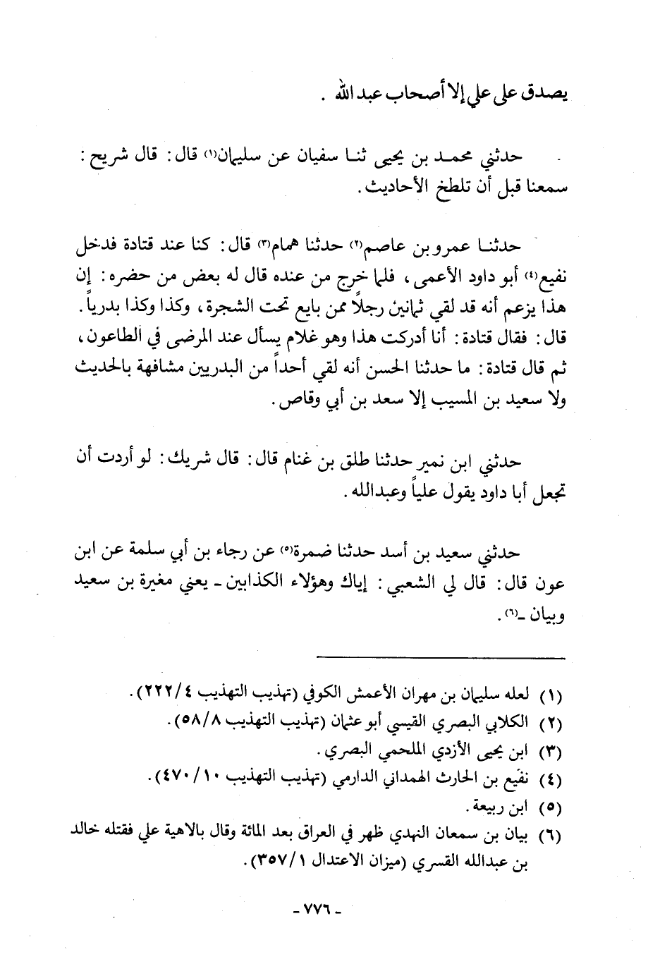 حَدَّثَنِي سَعِيدُ بْنُ أَسَدٍ حدثنا ضمرة [5] عن رجاء بن أبي سلمة عن ابن عون قال: قال لي الشعبي: إِيَّاكَ وَهَؤُلَاءِ الْكَذَّابِينَ- يَعْنِي مُغِيرَةَ بْنَ سَعِيدٍ وبيان-[6] .