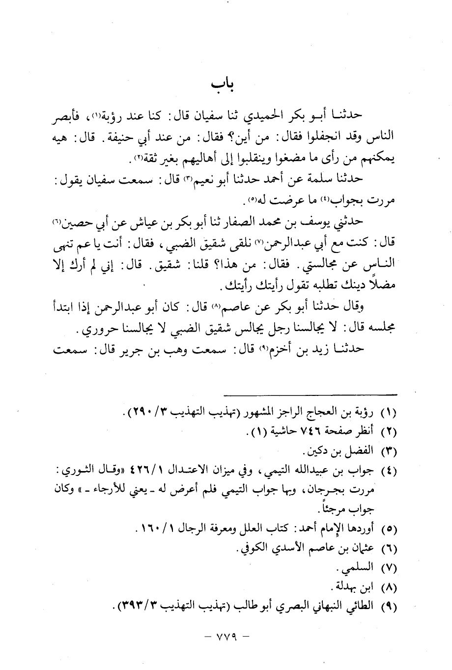ثنا أَبُو بَكْرٍ الْحُمَيْدِيُّ ثنا سُفْيَانُ قَالَ: كُنَّا عِنْدَ رُؤْبَةَ [1] ، فَأَبْصَرَ النَّاسَ وَقَدِ انجفلوا فَقَالَ: مِنْ أَيْنَ؟ فَقَالَ: مِنْ عِنْدِ أَبِي حَنِيفَةَ. قَالَ: هِيهْ يُمْكِنُهُمْ مِنْ رَأْيِ مَا مَضَغُوا وَيَنْقَلِبُوا إِلَى أَهَالِيهِمْ بِغَيْرِ ثِقَةٍ [2] .