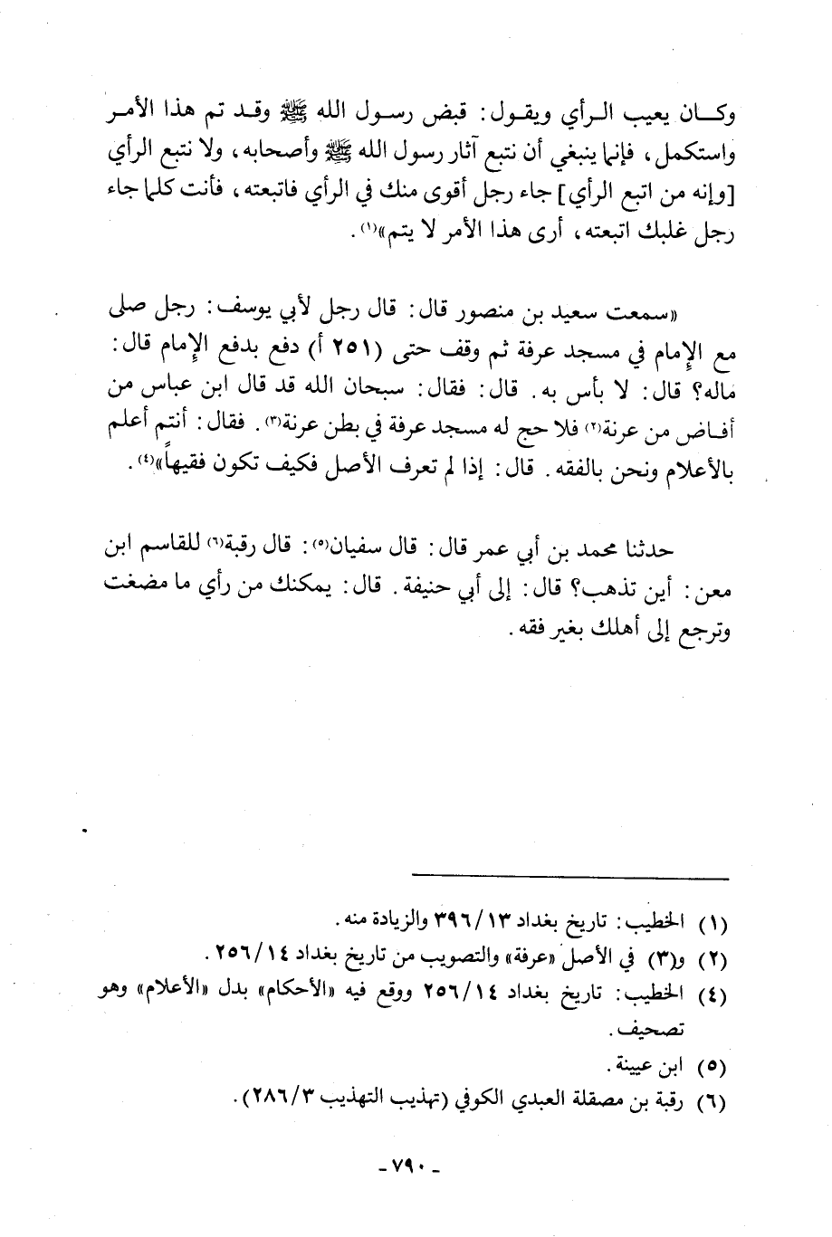 مَا لَهُ؟ قَالَ: لا بأس به. قال فقال: سبحان اللَّهِ قَدْ قَالَ ابْنُ عَبَّاسٍ مَنْ أَفَاضَ مِنْ عَرَنةَ [2] فَلَا حَجَّ لَهُ مَسْجِدُ عَرَفَةَ فِي بَطْنِ عَرْنَةَ [3] . فَقَالَ: أَنْتُمْ أَعْلَمُ بِالْإِعْلَامِ وَنَحْنُ بِالْفِقْهِ. قَالَ: إِذَا لَمْ تَعْرِفِ الْأَصْلَ فَكَيْفَ تَكُونُ فَقِيهًا» [4] .