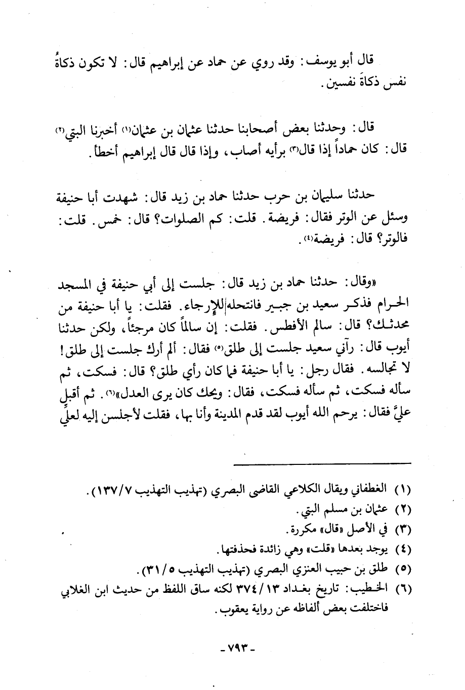 «وَقَالَ: حَدَّثَنَا حَمَّادُ بْنُ زَيْدٍ قَالَ: جَلَسْتُ إِلَى أَبِي حَنِيفَةَ فِي الْمَسْجِدِ الْحَرَامِ فَذَكَرَ سَعِيدَ بْنَ جُبَيْرٍ فَانْتَحَلَهُ لِلْأَرْجَاءِ. فَقُلْتُ: يَا أَبَا حَنِيفَةَ مَنْ مُحَدِّثُكَ؟ قَالَ: سَالِمٌ الْأَفْطَسُ. فَقُلْتُ: إِنَّ سَالِمًا كَانَ مُرْجِئًا، وَلَكِنْ حَدَّثَنَا أَيُّوبُ قَالَ: رَآنِي سَعِيدٌ جَلَسْتُ إِلَى طَلْقٍ [5] فَقَالَ: ألَمْ أَرَكَ جَلَسْتَ إِلَى طَلْقٍ! لَا تُجَالِسْهُ. فَقَالَ رَجُلٌ: يَا أَبَا حَنِيفَةَ فَمَا كَانَ رأي طلق؟ قال: