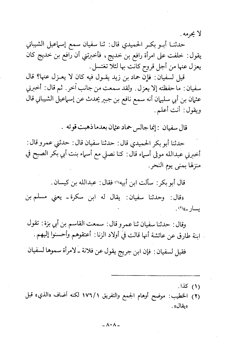 حَدَّثَنَا أَبُو بَكْرٍ الْحُمَيْدِيُّ قَالَ: ثنا سُفْيَانُ سَمِعَ إِسْمَاعِيلَ الشَّيْبَانِيَّ يَقُولُ: خلفت على امْرَأَةِ رَافِعِ بْنِ خَدِيجٍ، فَأَخْبَرَتْنِي أَنَّ رَافِعَ بْنَ خَدِيجٍ كَانَ يَعْزِلُ عَنْهَا مِنْ أَجْلِ قُرُوحٍ كَانَتْ بِهَا لِئَلَّا تَغْتَسِلَ.