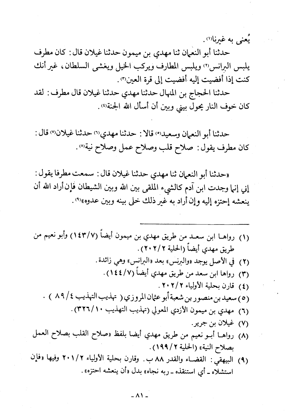 حَدَّثَنَا أَبُو النُّعْمَانِ وَسَعِيدٌ [5] قَالا: حَدَّثَنَا مَهْدِيٌّ [6] حَدَّثَنَا غَيْلَانُ [7] قَالَ: كَانَ مُطَرِّفٌ يَقُولُ: صَلَاحُ قَلْبٍ وَصَلَاحُ عمل وصلاح نية [8] .