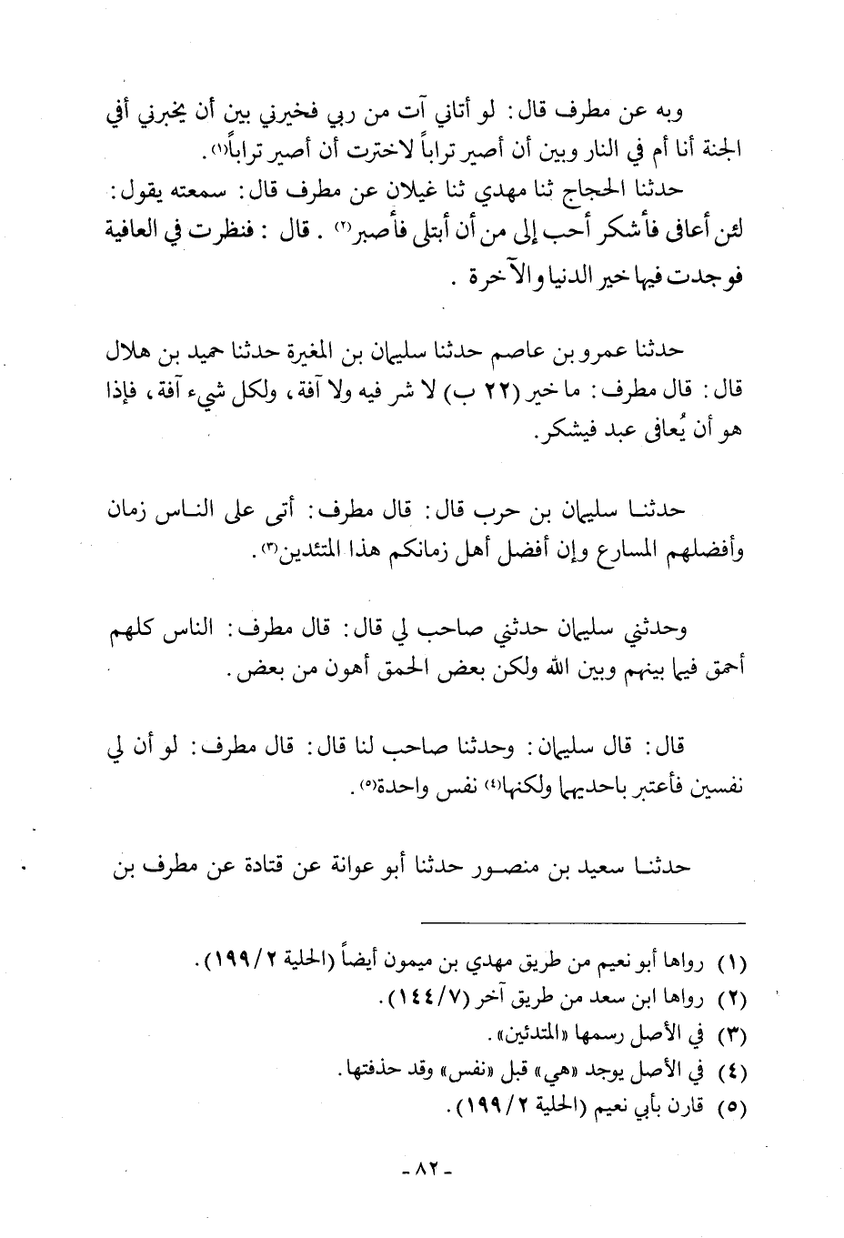 قَالَ: قَالَ سُلَيْمَانُ: وَحَدَّثَنَا صَاحِبٌ لَنَا قَالَ: قَالَ مُطَرِّفٌ: لَوْ أَنَّ لِي نَفْسَيْنِ فَأَعْتَبِرَ بِإِحْدَاهُمَا وَلَكِنَّهَا [4] نَفْسٌ وَاحِدَةٌ [5] .