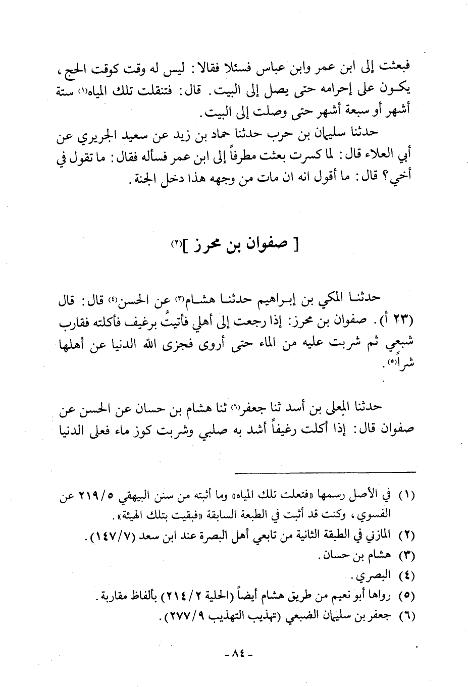 [2] حَدَّثَنَا الْمَكِّيُّ بْنُ إِبْرَاهِيمَ حَدَّثَنَا هشام [3] عن الحسن [4] قال: قال (23 أ) . صَفْوَانُ بْنُ مُحْرِزٍ: إِذَا رَجَعْتُ إِلَى أَهْلِي فَأُتِيتُ بِرَغِيفٍ فَأَكَلْتُهُ فَقَارَبَ شِبَعِي ثُمَّ شَرِبْتُ عَلَيْهِ مِنَ الْمَاءِ حَتَّى أَرْوَى فَجَزَى اللَّهُ الدُّنْيَا عَنْ أَهْلِهَا شَرًّا [5] .