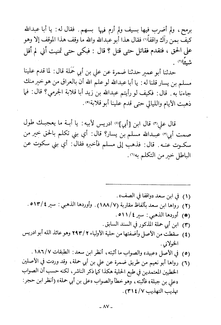 [6] أوردها ابو نعيم من طريق ضمرة عن علي بن أبي حملة، وقد وردت في الأصلين الخطيين المعتمدين في طبع الحلية هكذا كما ذكر الناشر، لكنه حسب أن الصواب «علي بن جبلة» فأثبته، وهو خطأ والصواب «علي بن أبي حملة» (انظر ابن حجر: تهذيب التهذيب 7/ 314) .