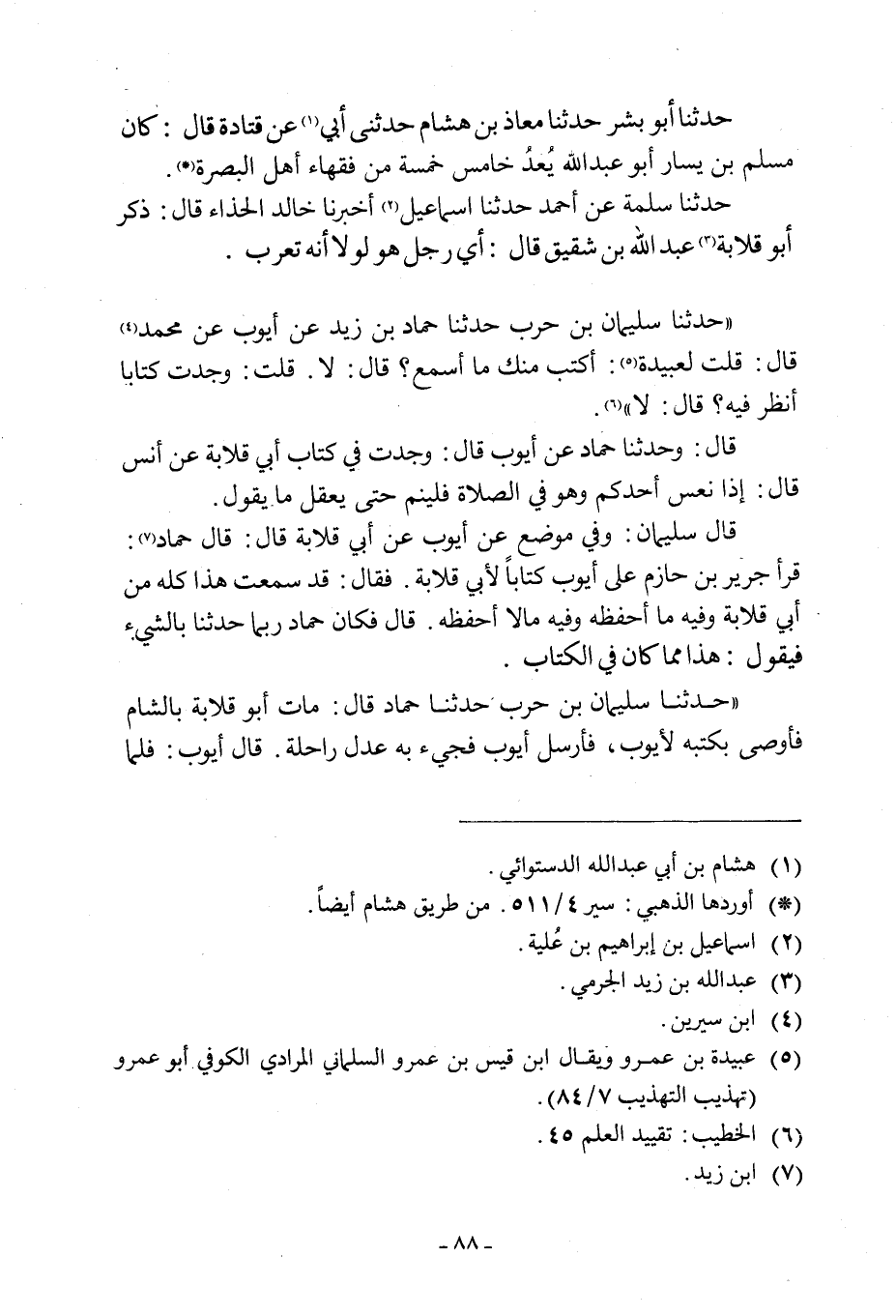 «حدثنا سليمان بن حرب حدثنا حماد بن زيد عن أَيُّوبَ عَنْ مُحَمَّدٍ [4] قَالَ: قُلْتُ لِعُبَيْدَةَ [5] : أَكْتُبُ مِنْكَ مَا أَسْمَعُ؟ قَالَ: لَا. قُلْتُ:
