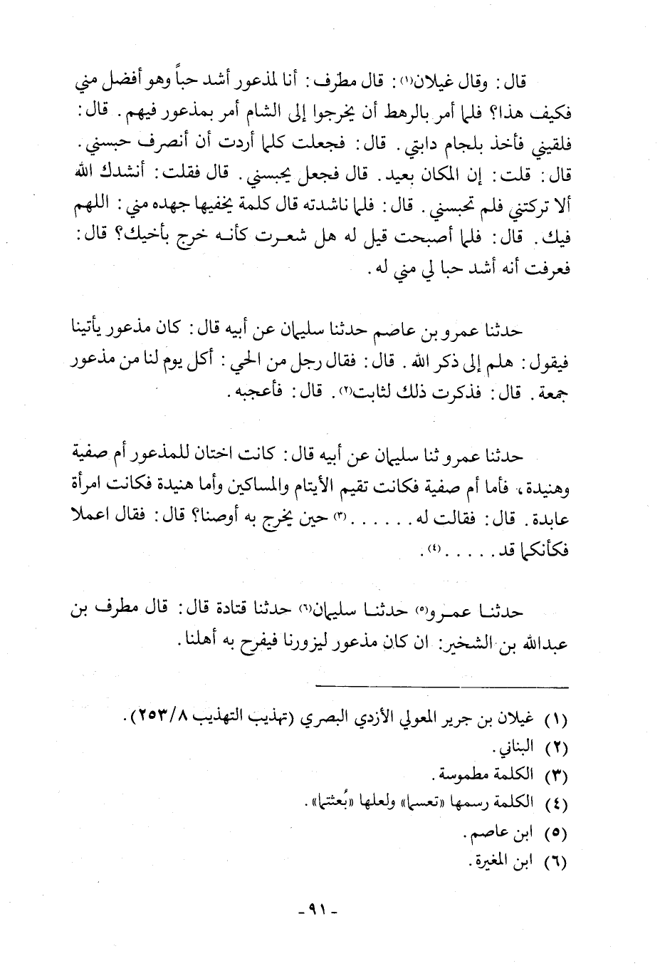 حَدَّثَنَا عَمْرٌو [5] حَدَّثَنَا سُلَيْمَانُ [6] حَدَّثَنَا قَتَادَةُ قَالَ: قَالَ مُطَرِّفُ بْنُ عَبْدِ اللَّهِ بْنِ الشِّخِّيرِ: إِنْ كَانَ مَذْعُورٌ ليزورنا فيفرح به أهلنا.