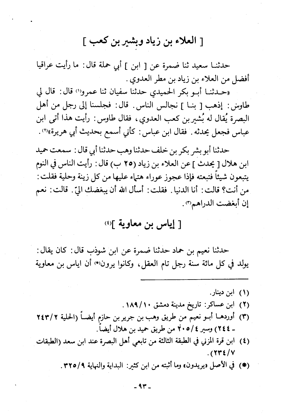 «حَدَّثَنَا أَبُو بَكْرٍ الْحُمَيْدِيُّ حَدَّثَنَا سُفْيَانُ ثَنَا عَمْرٌو [1] قَالَ: قَالَ لِي طَاوُسٌ: اذْهَبْ [بِنَا] نُجَالِسِ النَّاسَ. قَالَ: فَجَلَسْنَا إِلَى رَجُلٍ مِنْ أَهْلِ الْبَصْرَةِ يُقَالُ لَهُ بُشَيْرُ بْنُ كَعْبٍ الْعَدَوِيُّ، فَقَالَ طَاوُسٌ: رَأَيْتُ هَذَا أَتَى ابْنَ عَبَّاسٍ فَجَعَلَ يُحَدِّثُهُ. فَقَالَ ابْنُ عَبَّاسٍ: كَأَنِّي أَسْمَعُ بِحَدِيثِ أَبِي هُرَيْرَةَ» [2] حَدَّثَنَا أَبُو بِشْرٍ بَكْرُ بْنُ خَلَفٍ حَدَّثَنَا وَهْبٌ حَدَّثَنَا أَبِي قَالَ: سَمِعْتُ حميد ابن هلال [يحدث] عن العلاء بن زياد (25 ب) قَالَ: رَأَيْتُ النَّاسَ فِي النَّوْمِ يَتَّبِعُونَ شَيْئًا فَتَبِعْتُهُ فَإِذَا عَجُوزٌ عَوْرَاءٌ هَتْمَاءٌ عَلَيْهَا مِنْ كُلِّ زِينَةٍ وَحِلْيَةٍ فَقُلْتُ: مَنْ أَنْتِ؟ قَالَتْ: أَنَا الدُّنْيَا. فَقُلْتُ: أَسْأَلُ اللَّهَ أَنْ يُبَغِّضَكَ إِلَيَّ.