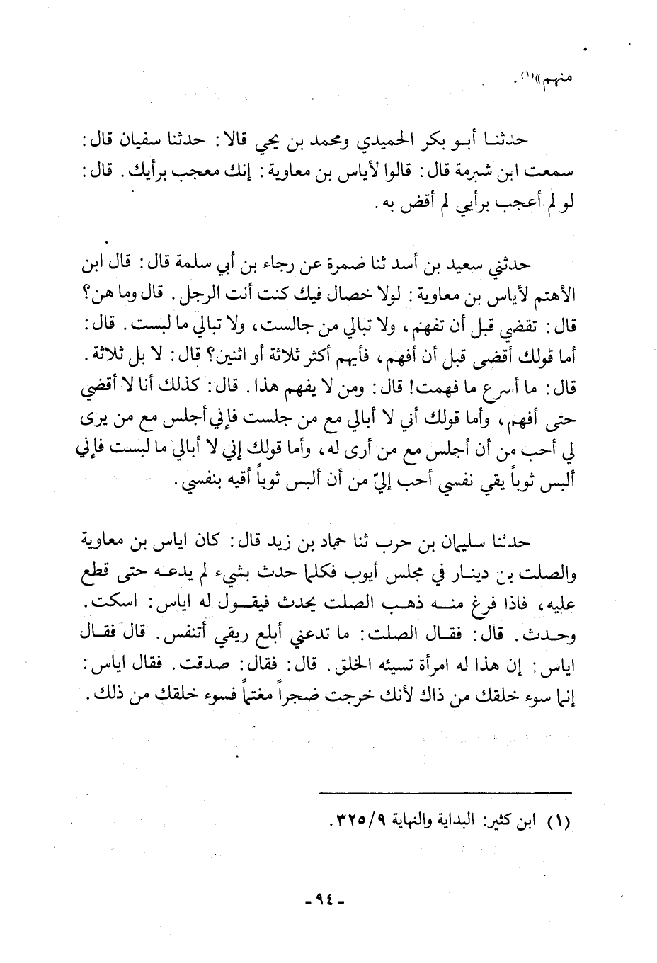 حدثني سعيد بن أسد ثنا ضمرة عن رَجَاءِ بْنِ أَبِي سَلَمَةَ قَالَ: قَالَ ابْنُ الْأَهْتَمِ لِإِيَاسِ بْنِ مُعَاوِيَةَ: لَوْلَا خِصَالٌ فِيكَ كُنْتَ أَنْتَ الرَّجُلَ. قَالَ: وَمَا هُنَّ؟ قَالَ: تَقْضِي قَبْلَ أَنْ تَفْهَمْ، وَلَا تُبَالِي مَنْ جَالَسْتَ، وَلَا تُبَالِي مَا لَبِسْتَ.