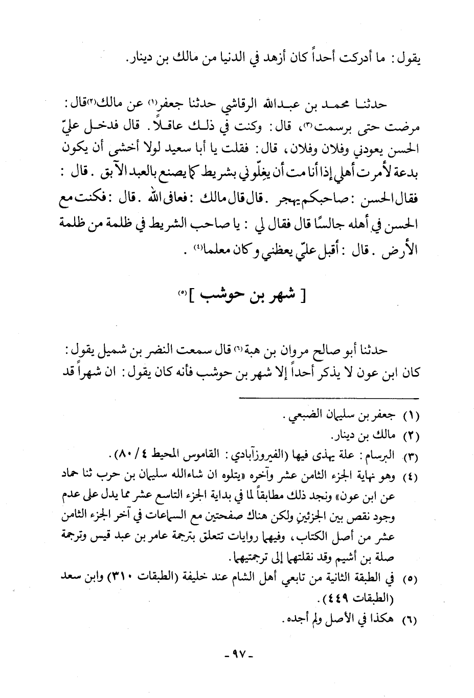 [5] وهو نهاية الجزء الثامن عشر وآخره «يتلوه ان شاء الله سليمان بن حرب ثنا حماد عن ابن عون» ونجد ذلك مطابقا لما في بداية الجزء التاسع عشر مما يدل على عدم وجود نقص بين الجزئين ولكن هناك صفحتين مع السماعات في آخر الجزء الثامن عشر من أصل الكتاب، وفيهما روايات تتعلق بترجمة عامر بن عبد قيس وترجمة صلة بن أشيم وقد نقلتهما الى ترجمتيهما.