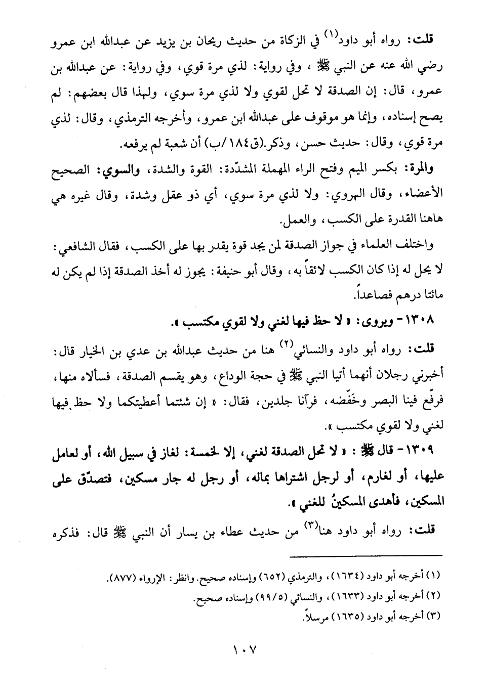 1309 - قال -صلى الله عليه وسلم-: "لا تحل الصدقة لغني، إلا لخمسة: لغاز في سبيل الله، أو لعامل عليها، أو لغارم، أو لرجل اشتراها بماله، أو رجل له جار مسكين، فتصدّق على المسكين، فأهدى المسكينُ للغني".