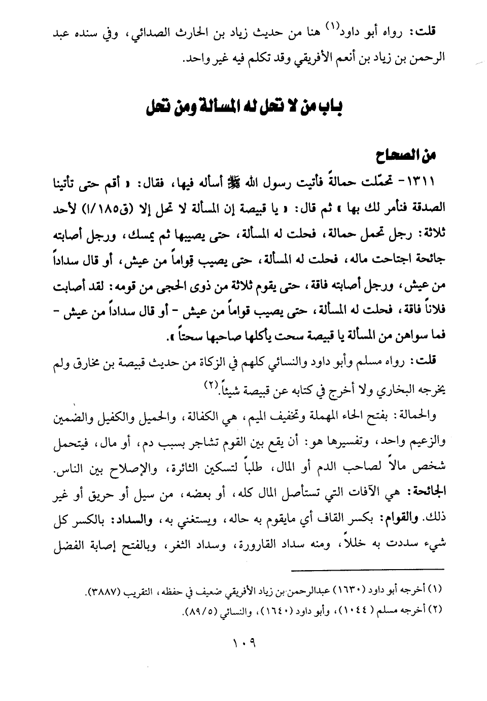 1311 - تحمّلت حمالةً فأتيت رسول الله - صلى الله عليه وسلم - أسأله فيها، فقال: "أقم حتى تأتينا الصدقة فنأمر لك بها" ثم قال: "يا قبيصة إن المسألة لا تحل إلا لأحد ثلاثة: رجل تحمل حمالة، فحلت له المسألة، حتى يصيبها ثم يمسك، ورجل أصابته جائحة اجتاحت ماله، فحلت له المسألة، حتى يصيب قِوامًا من عيش، أو قال سدادًا من عيش، ورجل أصابته فاقة، حتى يقوم ثلاثة من ذوى الحجى من قومه: لقد أصابت فلانًا فاقة، فحلت له المسألة، حتى يصيب قوامًا من عيش -أو قال سدادًا من عيش- فما سواهن من المسألة يا قبيصة سحت يأكله صاحبها سحتًا".