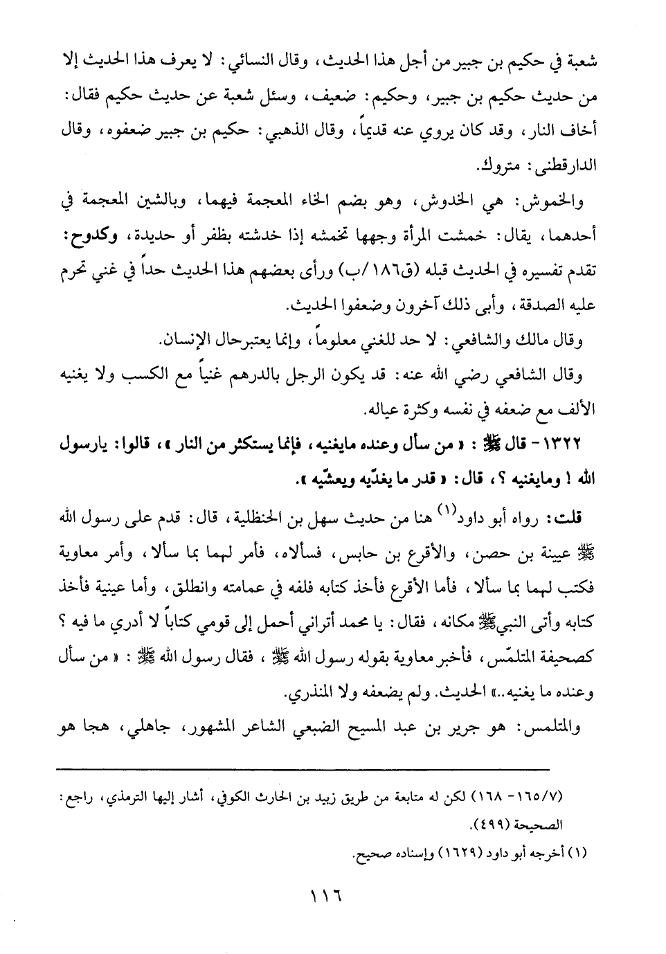 1322 - قال - صلى الله عليه وسلم -: "من سأل وعنده ما يغنيه، فإنما يستكثر من النار"، قالوا: يا رسول الله! وما يغنيه؟، قال: "قدر ما يغذيه ويعشّيه".