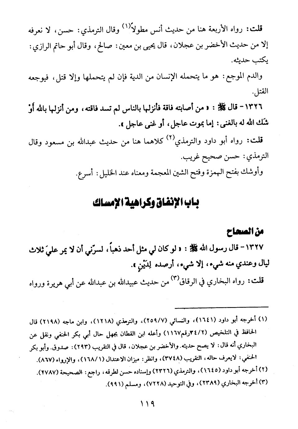(¬1) أخرجه أبو داود (1641)، والنسائي (7/ 259)، والترمذي (1218)، وابن ماجه (2198) قال الحافظ في التلخيص (2/ 34 رقم 1167) وأعله ابن القطان بجهل حال أبي بكر الحنفي ونقل عن البخاري أنه قال: لا يصح حديثه. والأخضر بن عجلان، قال في التقريب (293): صدوق. وأبو بكر الحنفي: لا يعرف حاله، التقريب (3748) , وانظر: ميزان الاعتدال (1/ 168)، والإرواء (867).