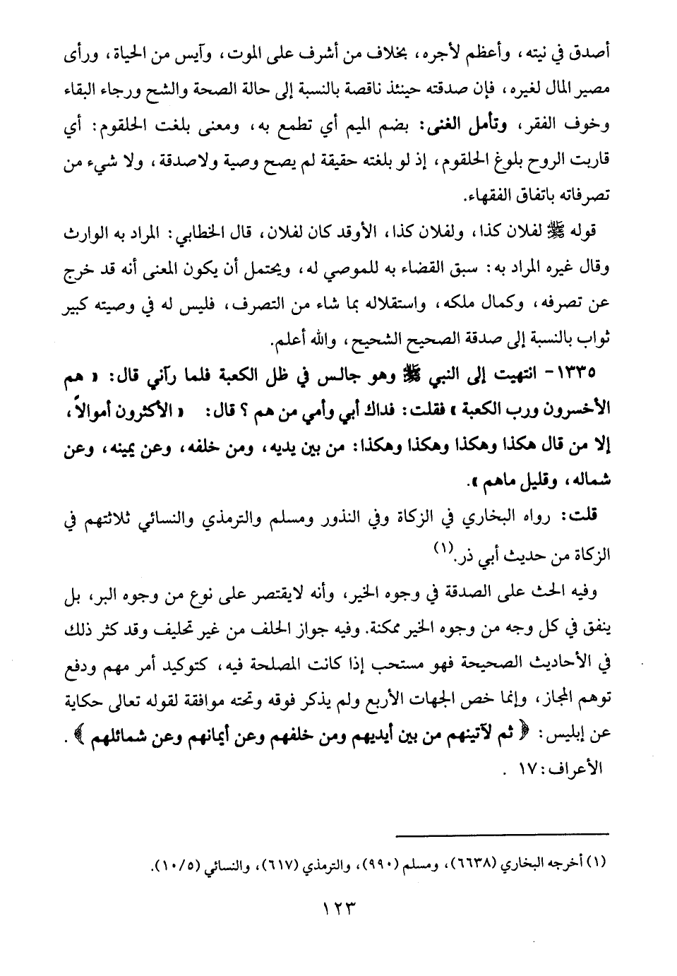 قلت: رواه البخاري في الزكاة وفي النذور ومسلم والترمذي والنسائي ثلاثتهم في الزكاة من حديث أبي ذر. (¬1)