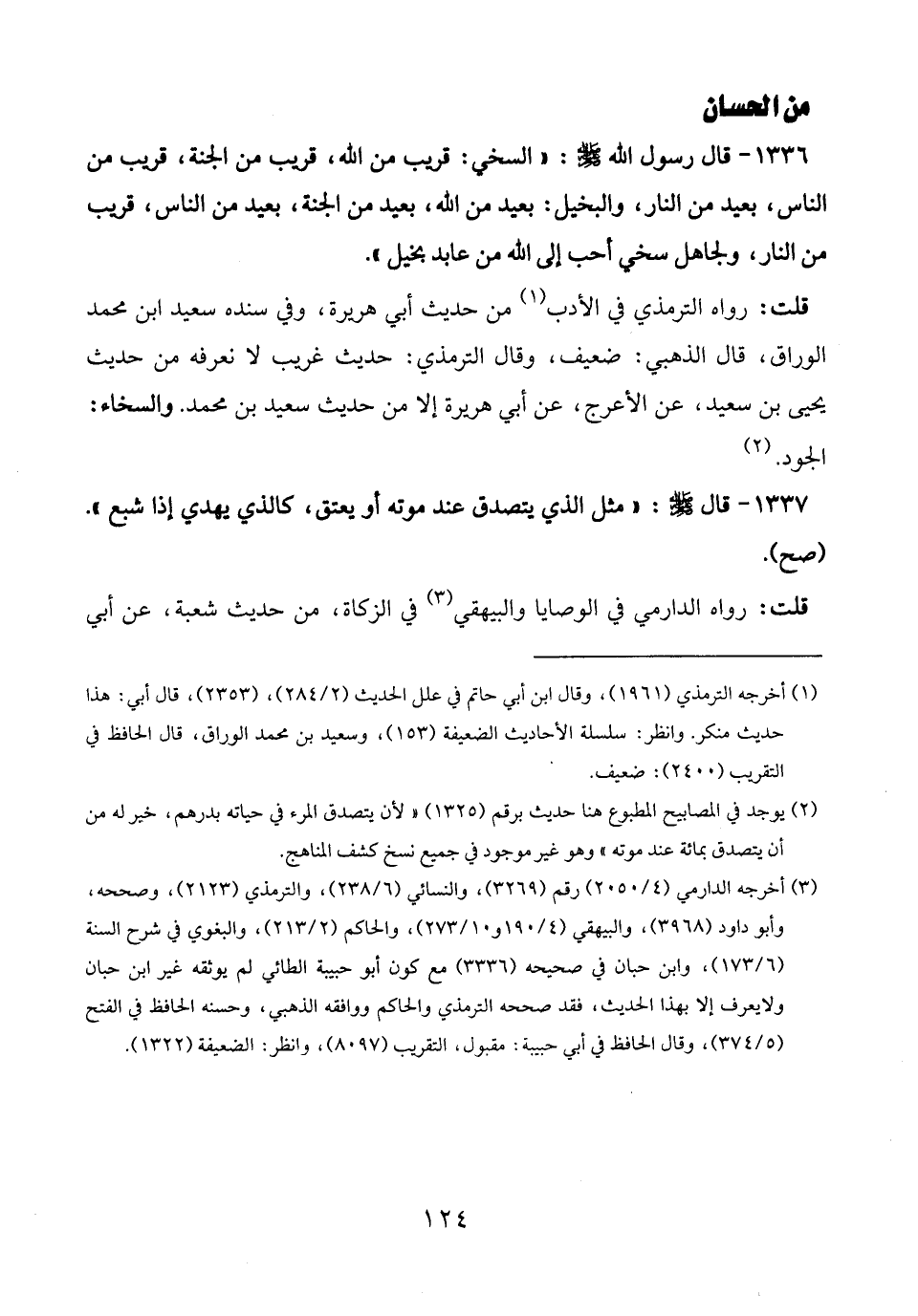 (¬2) يوجد في المصابيح المطبوع هنا حديث برقم (1325) "لأن يتصدق المرء في حياته بدرهم، خير له من أن يتصدق بمائة عند موته" وهو غير موجود في جميع نسخ كشف المناهج.