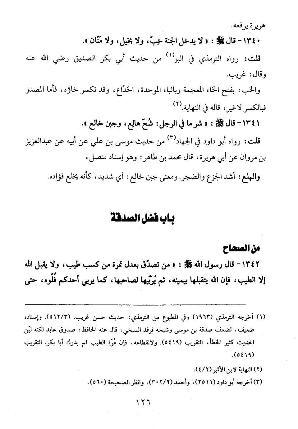1340 - قال - صلى الله عليه وسلم -: "لا يدخل الجنة خِبّ، ولا بخيل، ولا مَنّان".