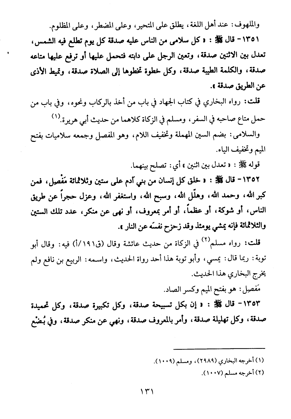 1351 - قال - صلى الله عليه وسلم -: "كل سلامى من الناس عليه صدقة كل يوم تطلع فيه الشمس، تعدل بين الاثنين صدقة، وتعين الرجل على دابته فتحمل عليها أو ترفع عليها متاعه صدقة، والكلمة الطيبة صدقة، وكل خطوة تخطوها إلى الصلاة صدقة، وتميط الأذى عن الطريق صدقة".